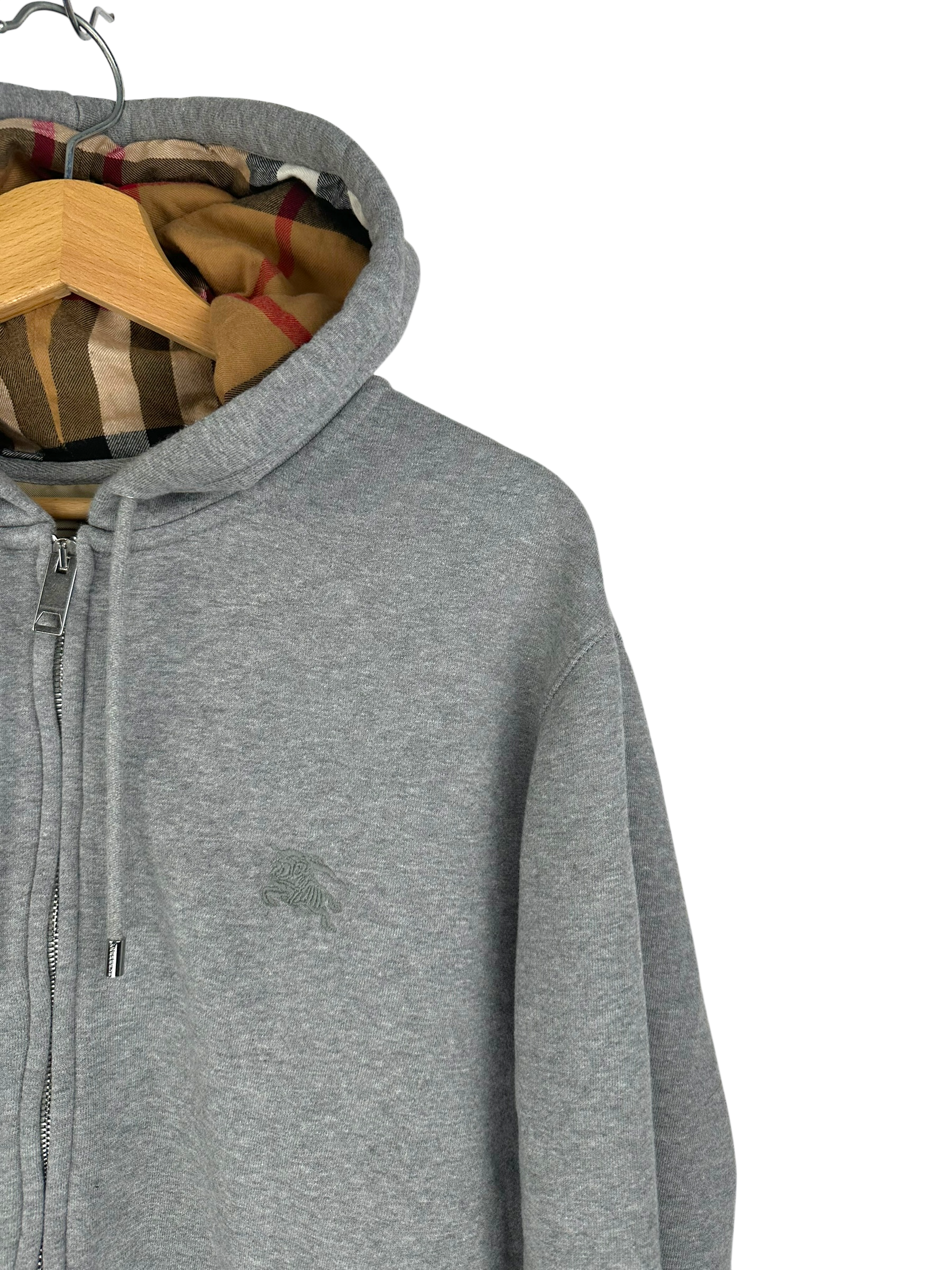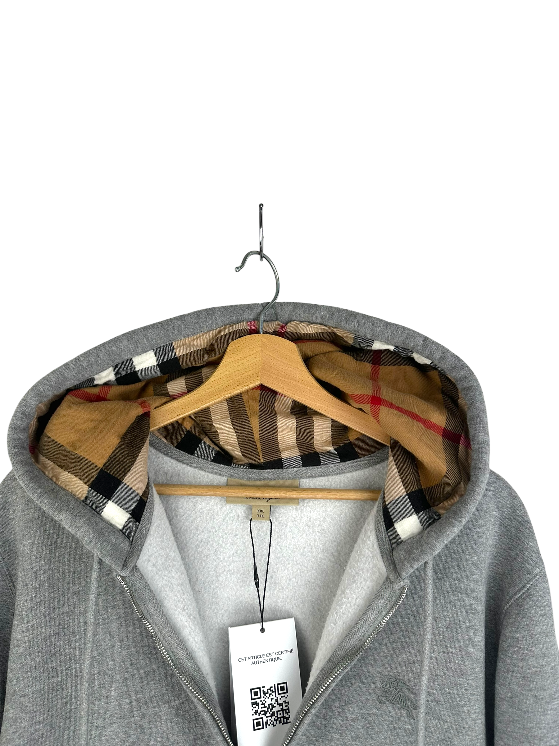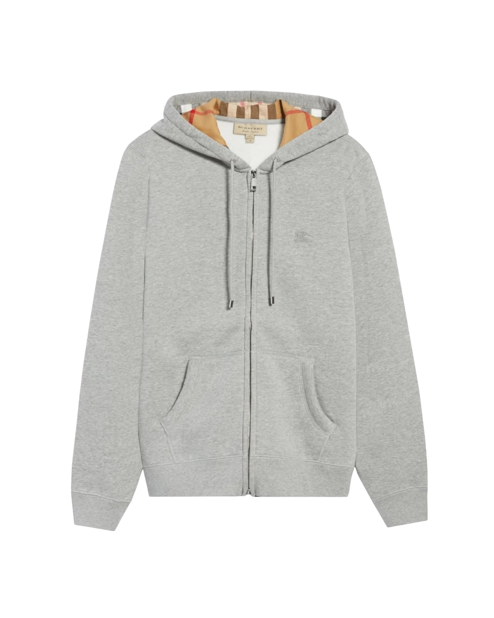 Sweatshirt zippé en molleton gris chiné, capuche doublée du motif check emblématique Burberry en sergé de coton, cordons de serrage ton sur ton avec embouts métalliques, zip métal double curseur, poches kangourou, logo cavalier brodé ton sur ton sur la poitrine gauche, bords-côtes au bas du corps et aux poignets, étiquette de marque Burberry à l’intérieur du col.