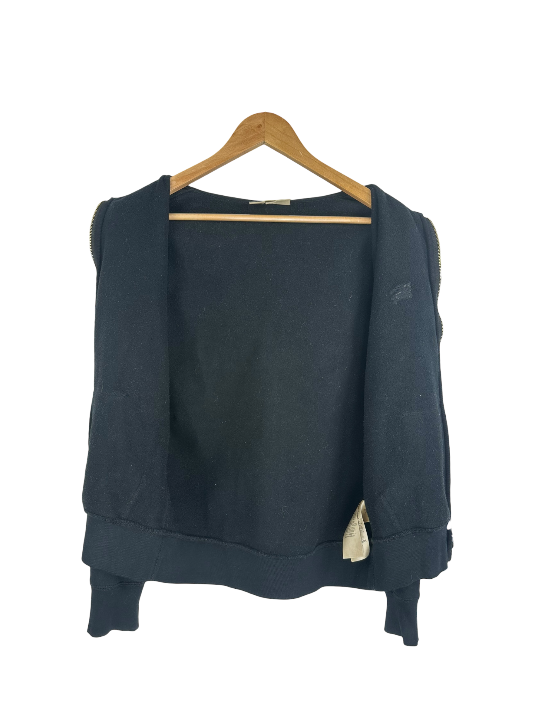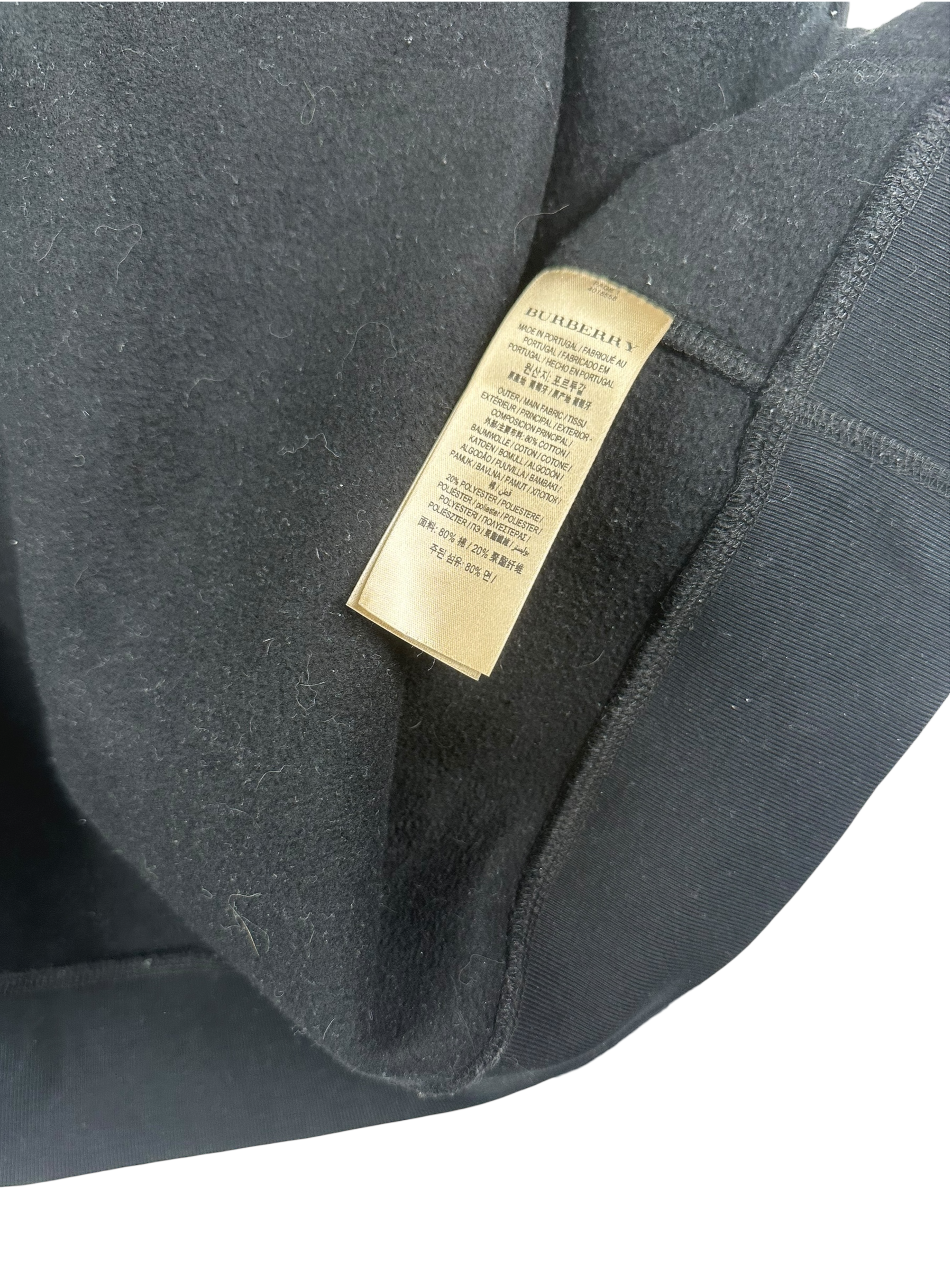 Gilet BURBERRY à capuche noir avec monogramme dans la capuche en doublure et logo ton sur ton sur la poitrine.