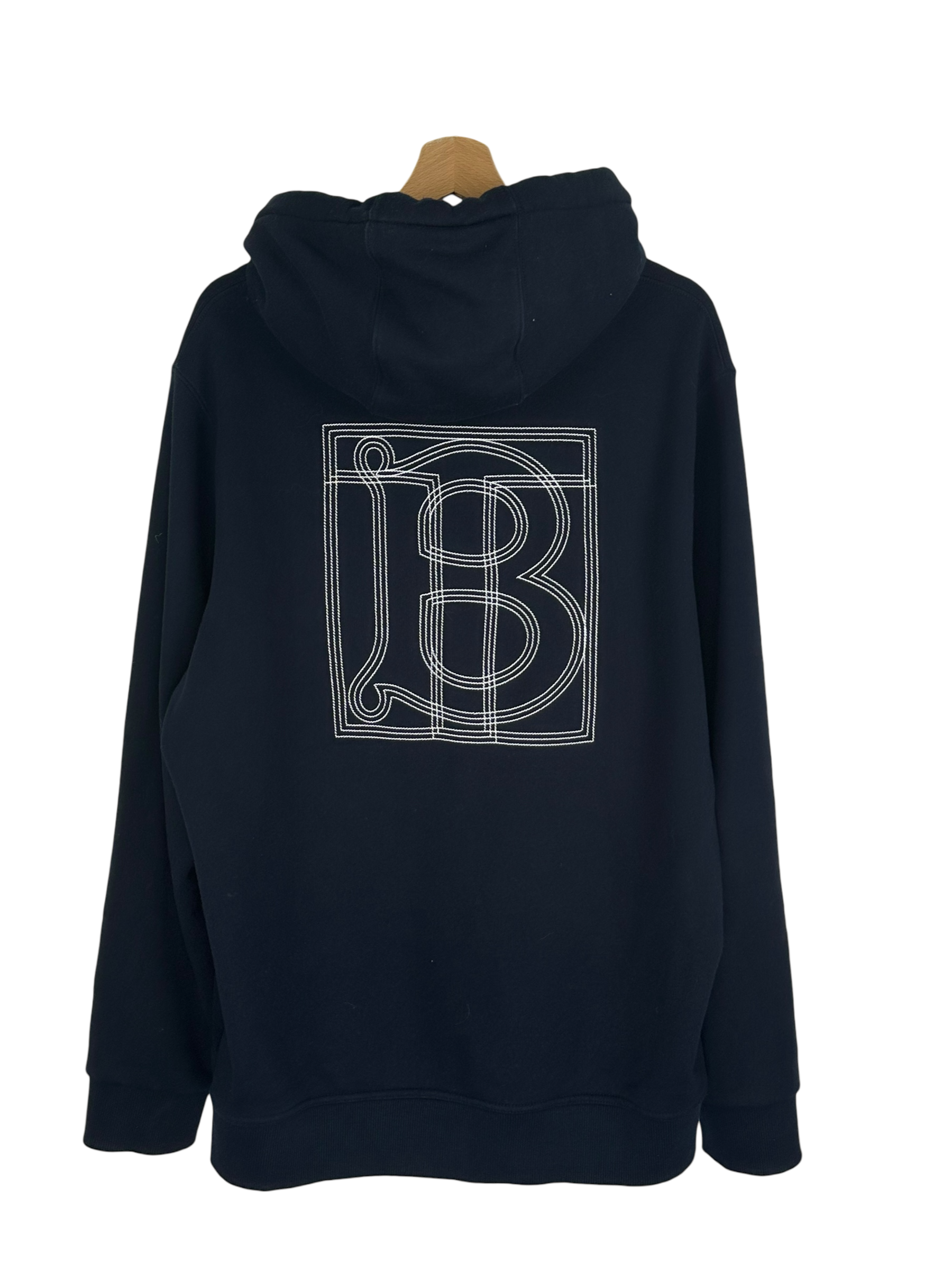 Sweat à capuche marine en molleton, poche kangourou, cordons plats noirs, motif brodé au dos, poignets et ourlet en bord-côte.