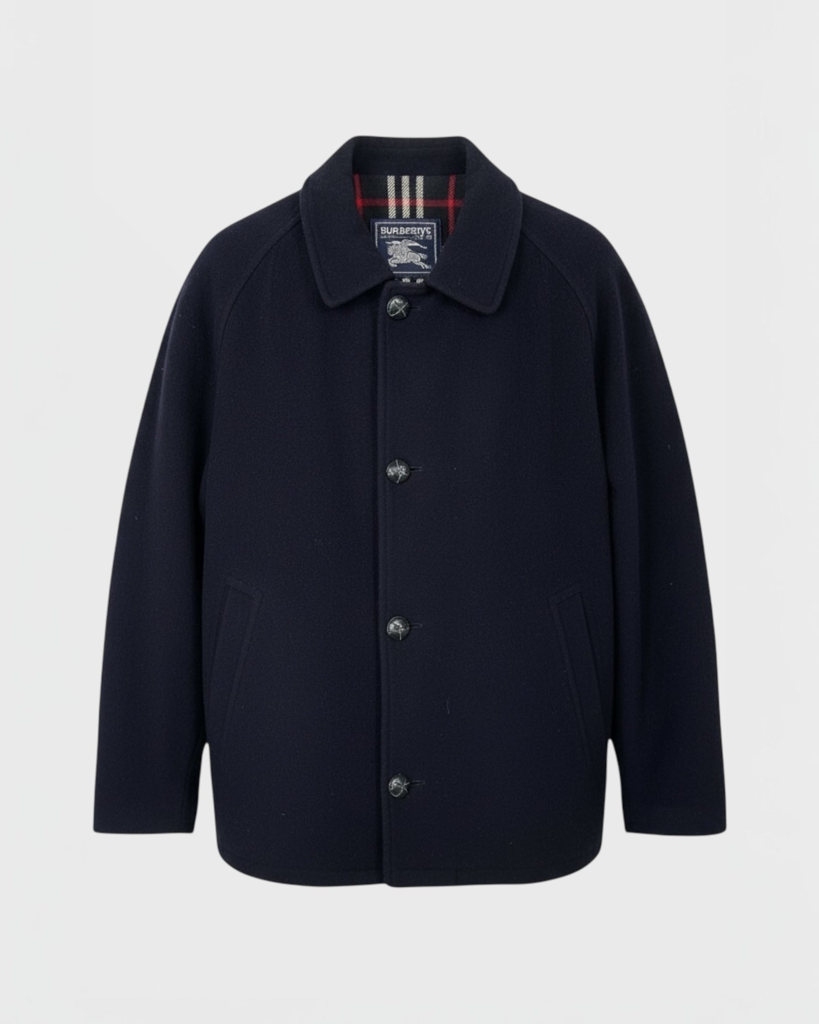 Veste en laine marine avec doublure tartan signature Burberrys, boutons devant, col simple, poches latérales, patte boutonnée aux poignets.