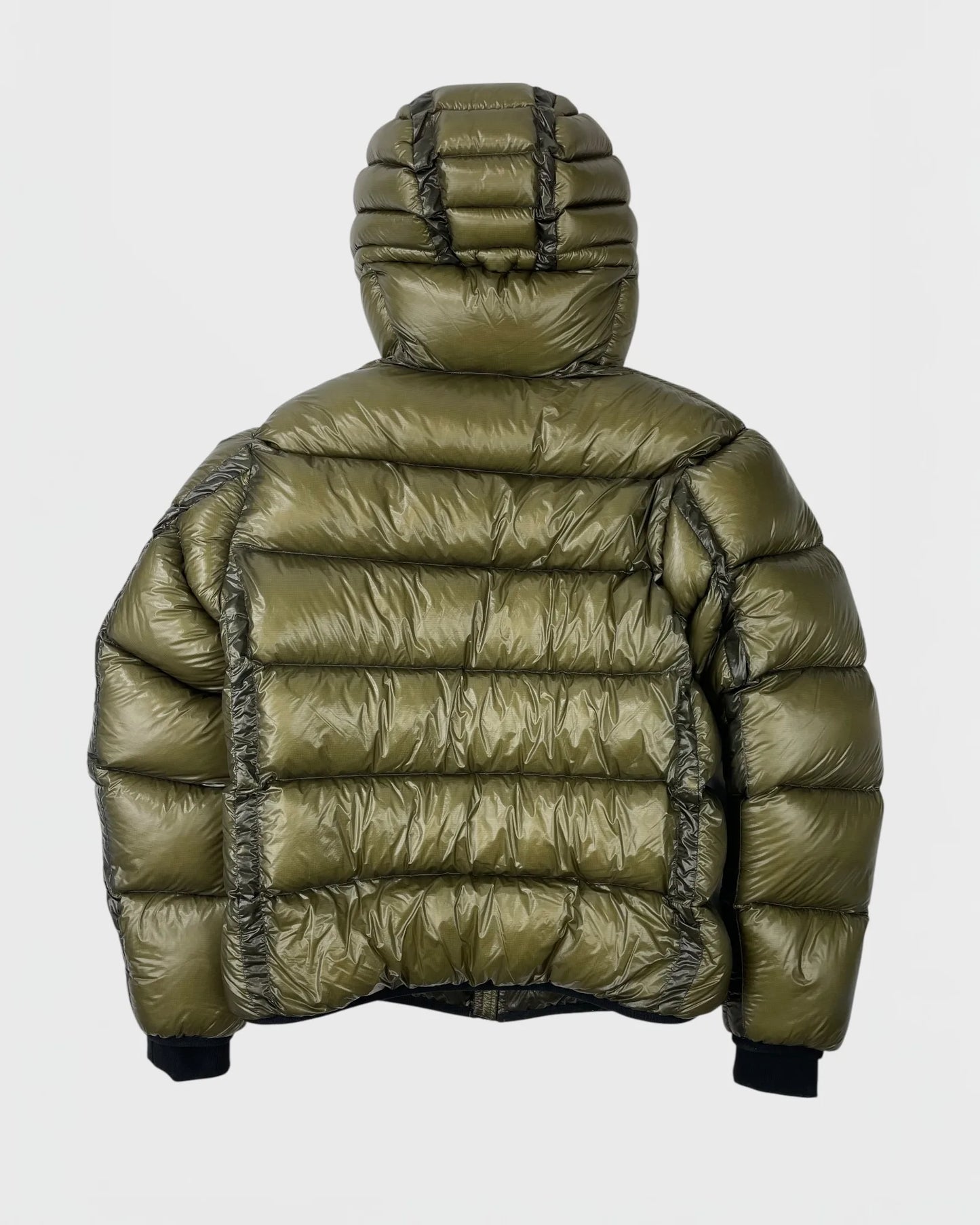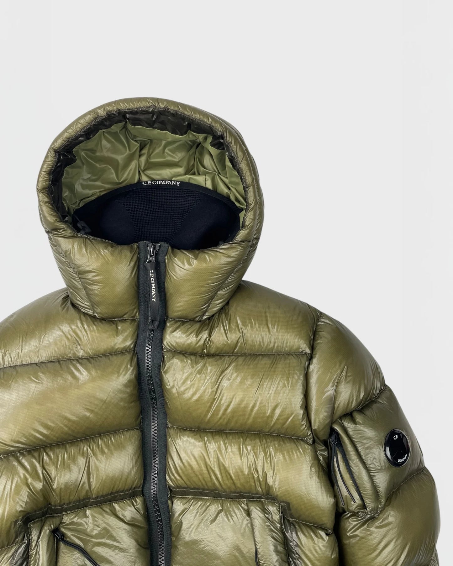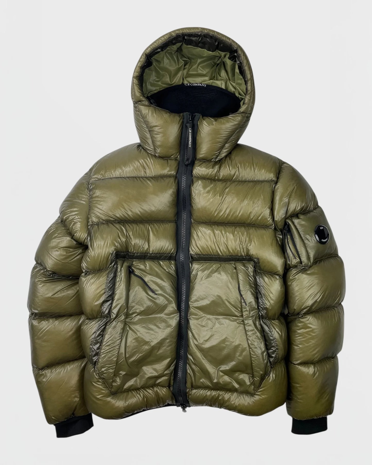 Doudoune vert olive, finition brillante, grandes poches zippées à l'avant, capuche intégrée, patch rond vitre signature C.P. Company sur la manche, poignets côtelés noirs, matelassage horizontal, doublure intérieure technique avec étiquettes.