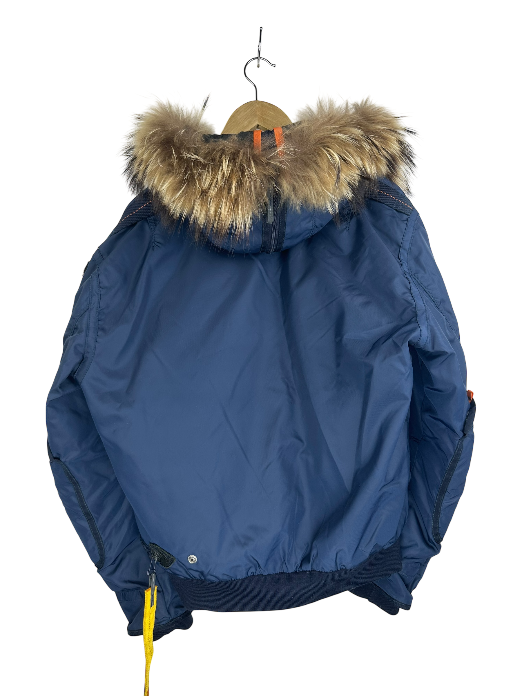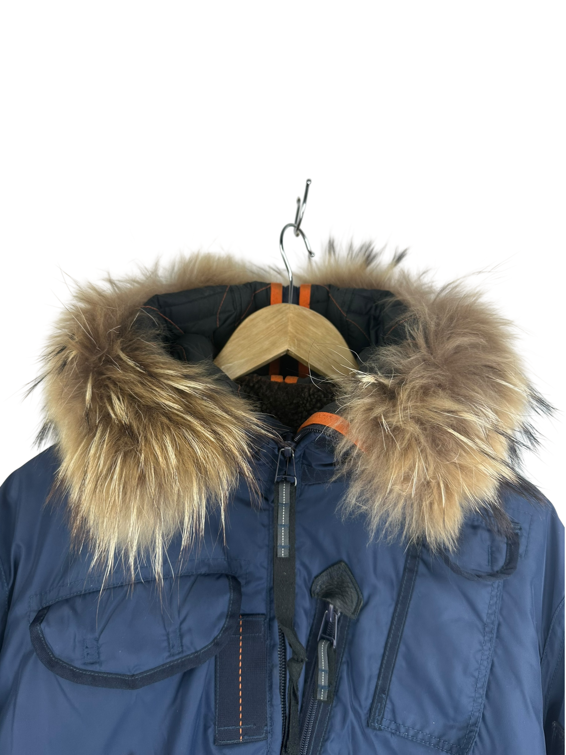 Doudoune à fourrure Parajumpers en excellent état, peu utilisée, sans défauts notables. Conçue en nylon technique, elle dispose d'une capuche à fourrure et d'une doublure matelassée. Ses multiples poches cargo et zippées offrent une fonctionnalité pratique, tandis que les renforts matelassés améliorent la durabilité et le confort.