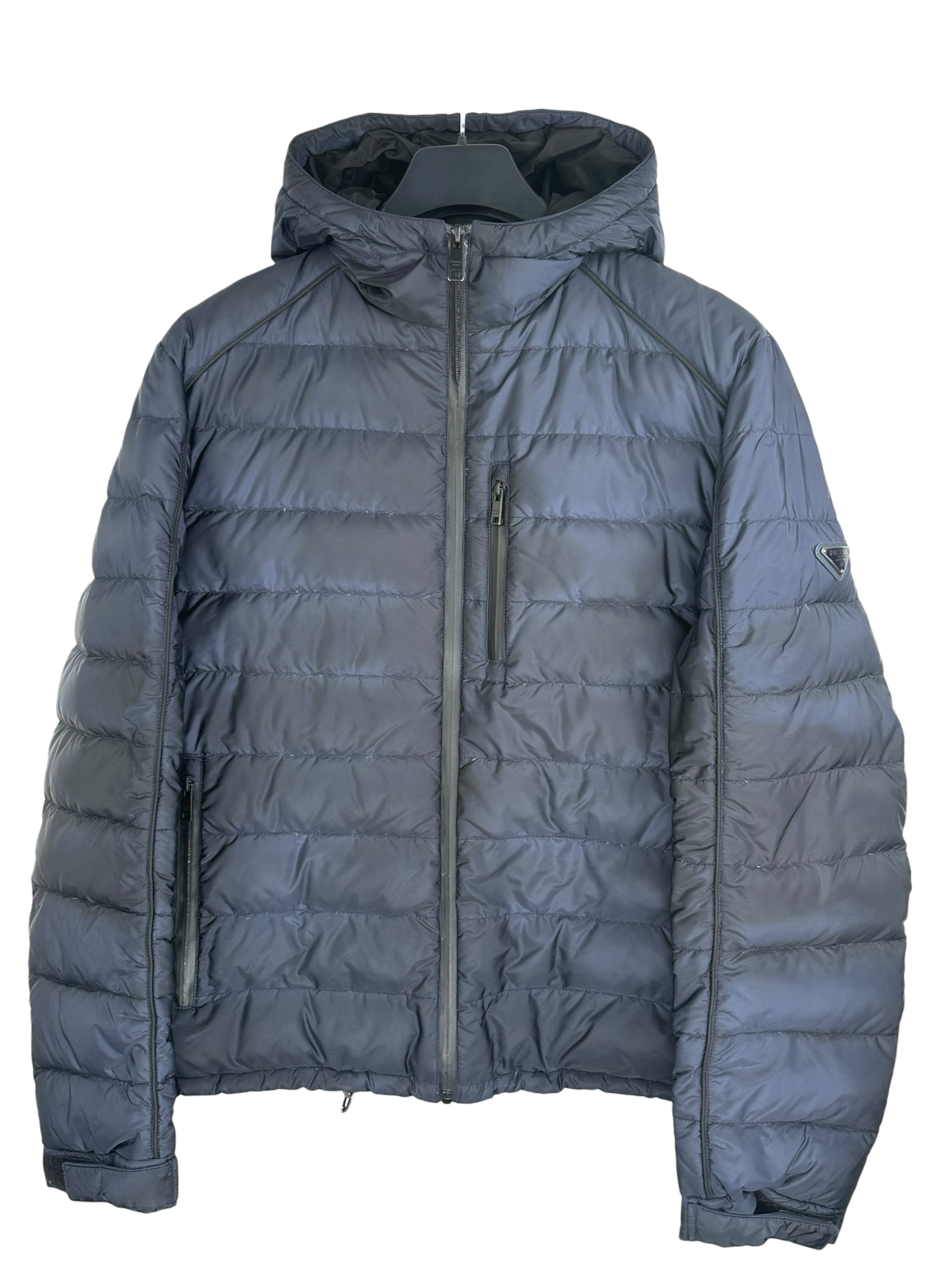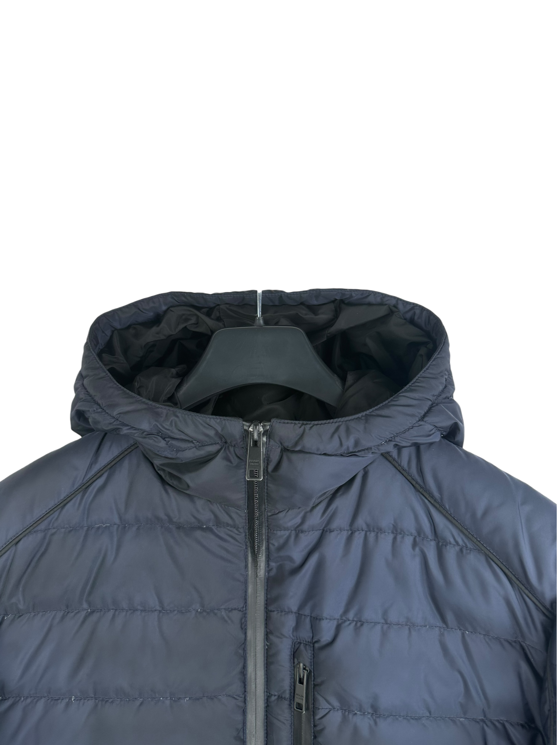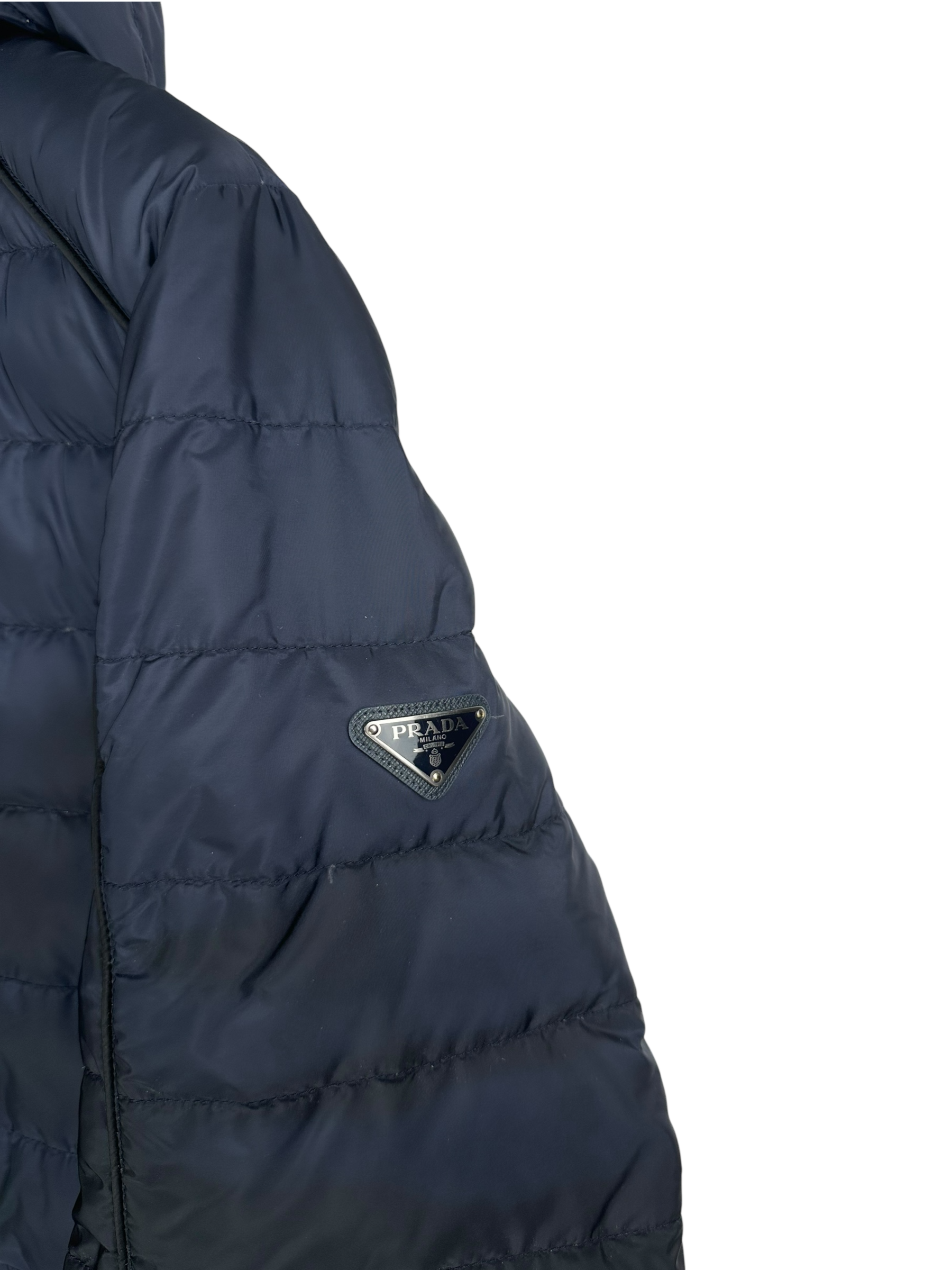 Doudoune Prada matelassée bleu marine en nylon, doublure marine, capuche, fermeture éclair frontale, logo Prada triangulaire cousu sur la manche gauche, poches intérieures boutonnées.
