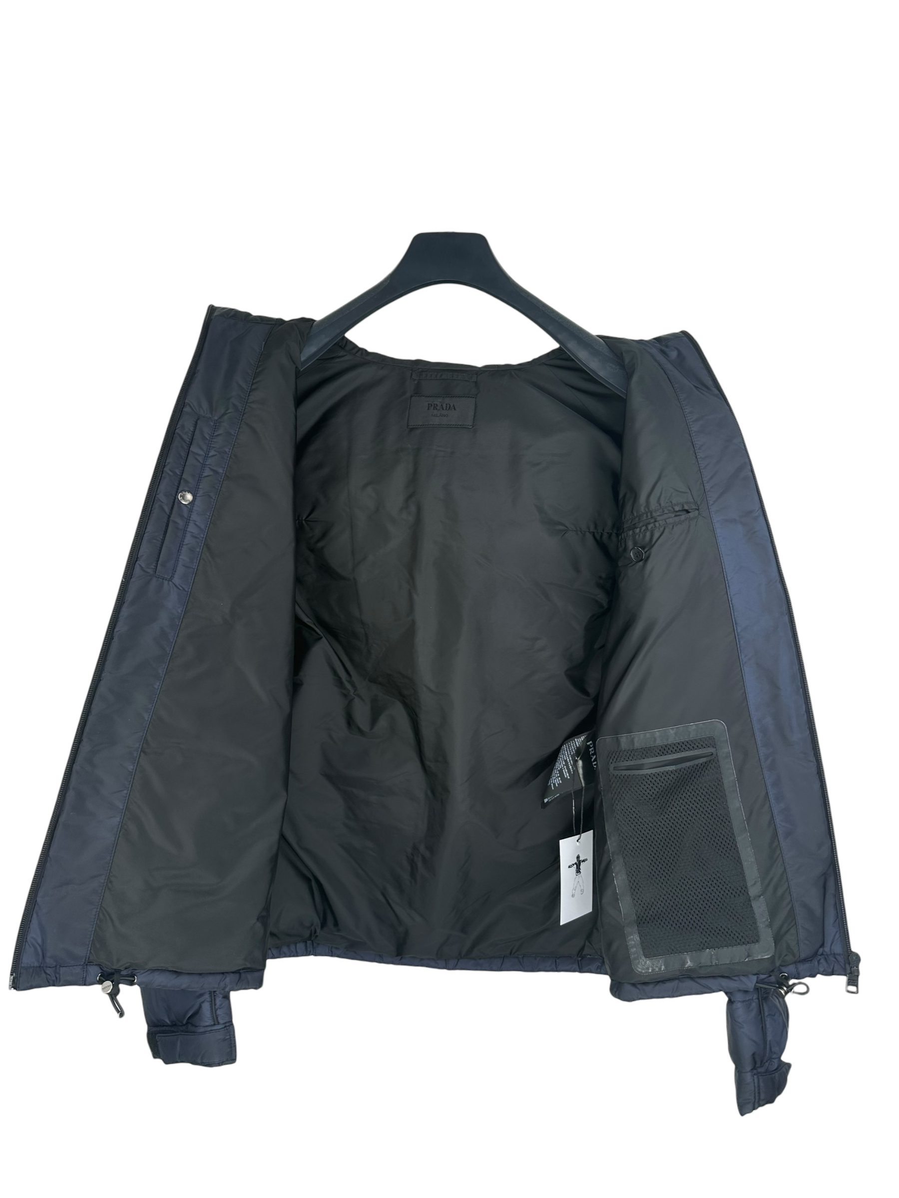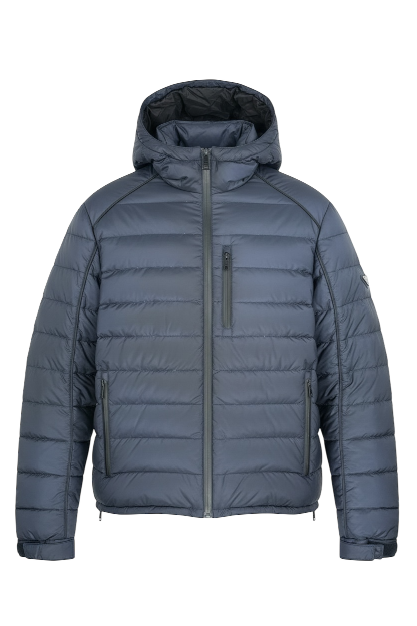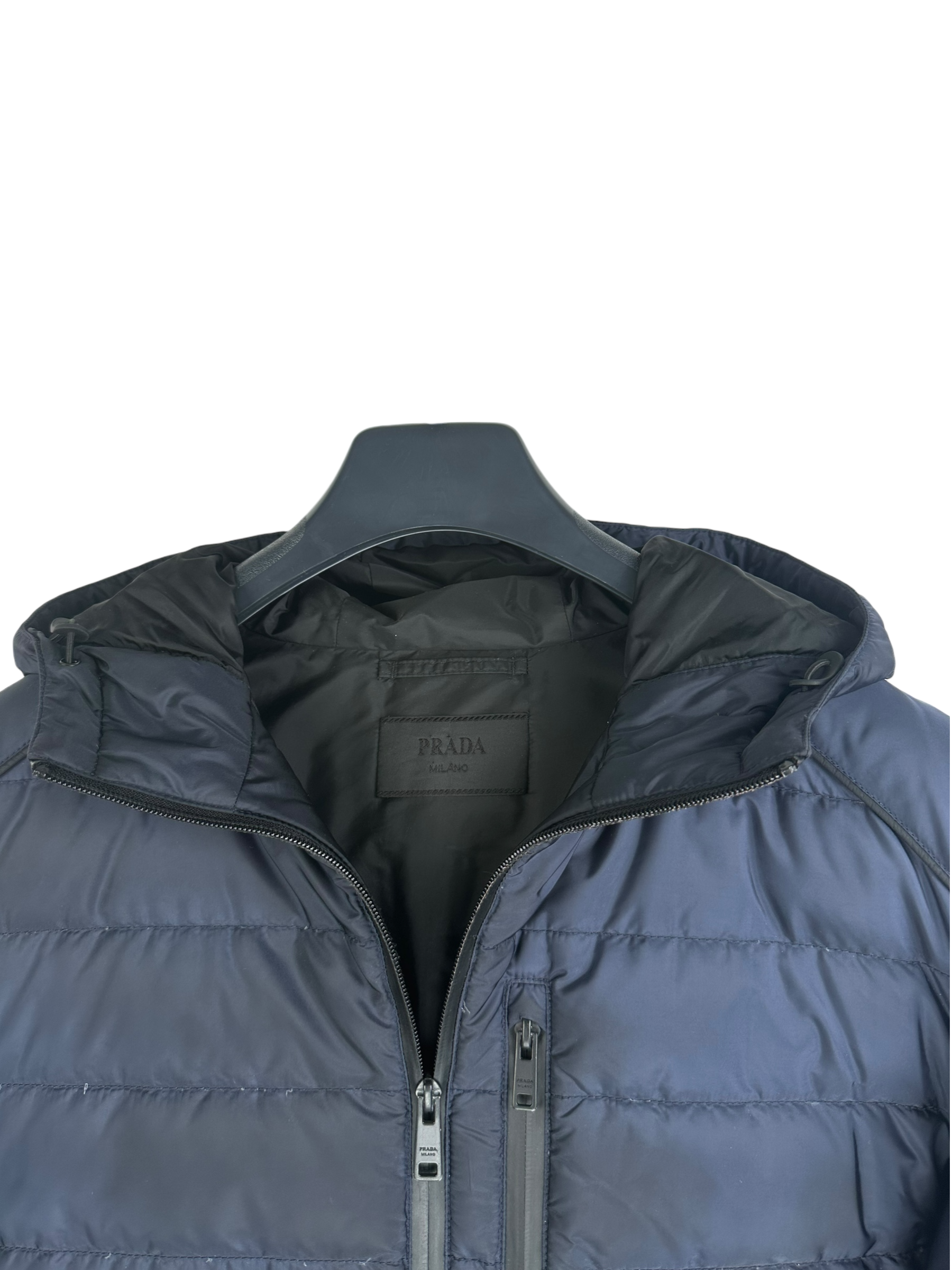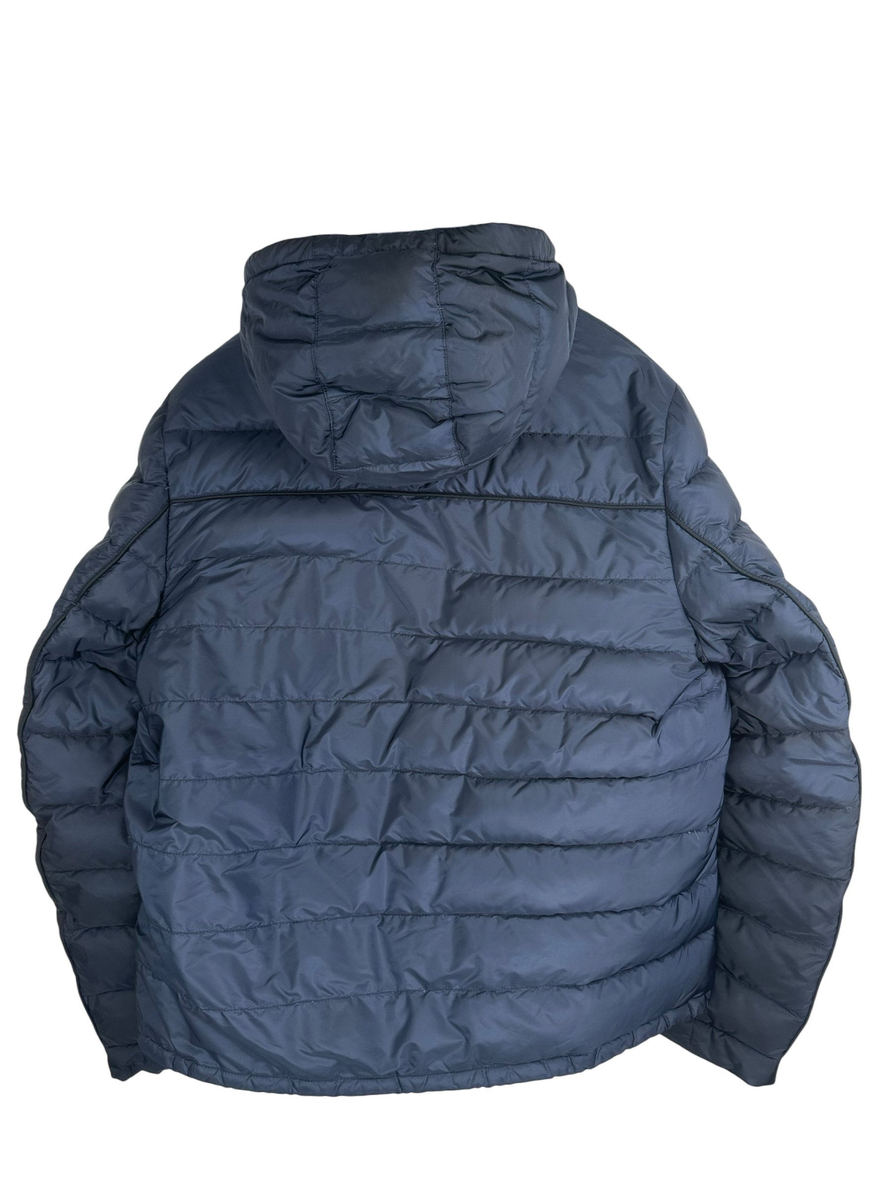 Doudoune Prada matelassée bleu marine en nylon, doublure marine, capuche, fermeture éclair frontale, logo Prada triangulaire cousu sur la manche gauche, poches intérieures boutonnées.