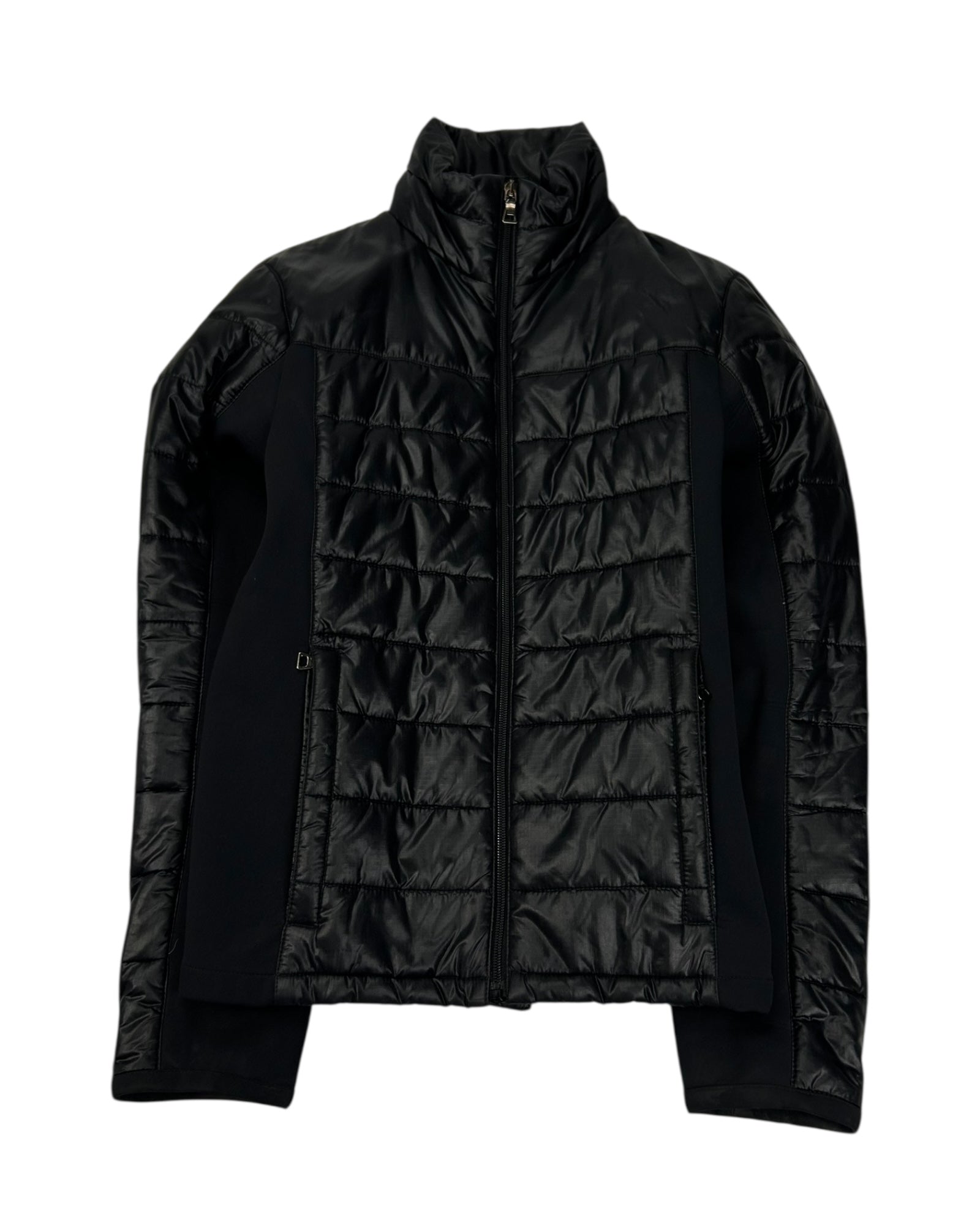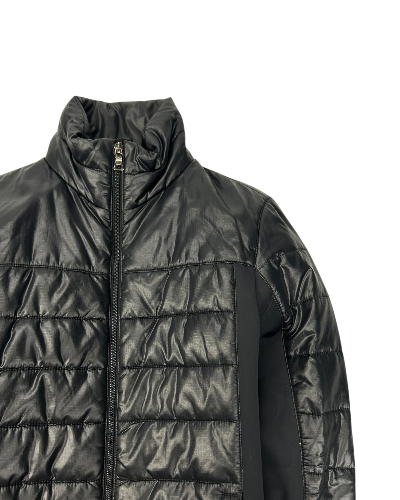 La doudoune est noire brillante matelassée avec empiècements softshell noirs contrastés sur côtés et manches, col montant, fermeture zippée centrale avec double curseur, deux poches latérales zippées. L’intérieur est matelassé avec garnissage duvet, comportant poches internes et étiquettes techniques,