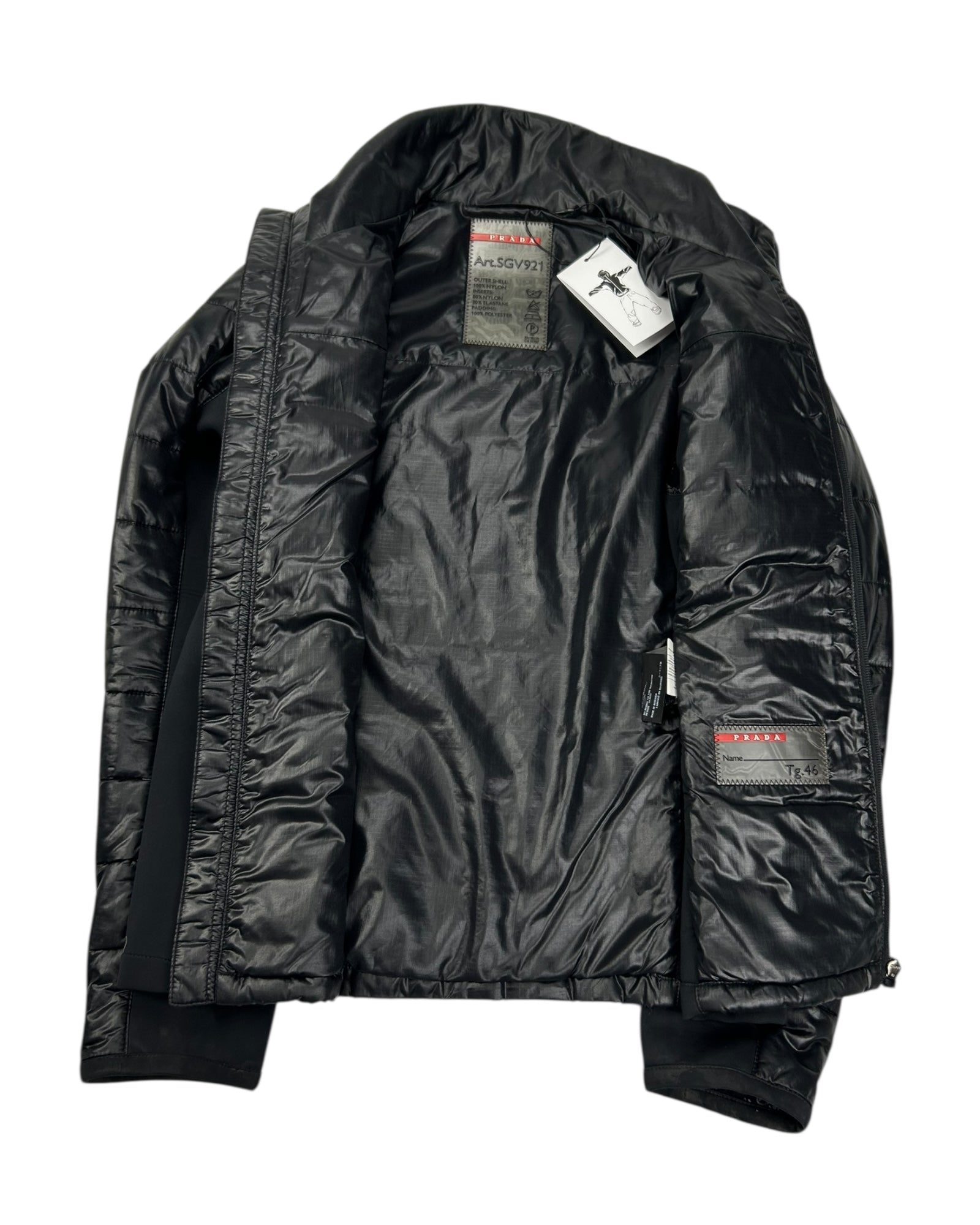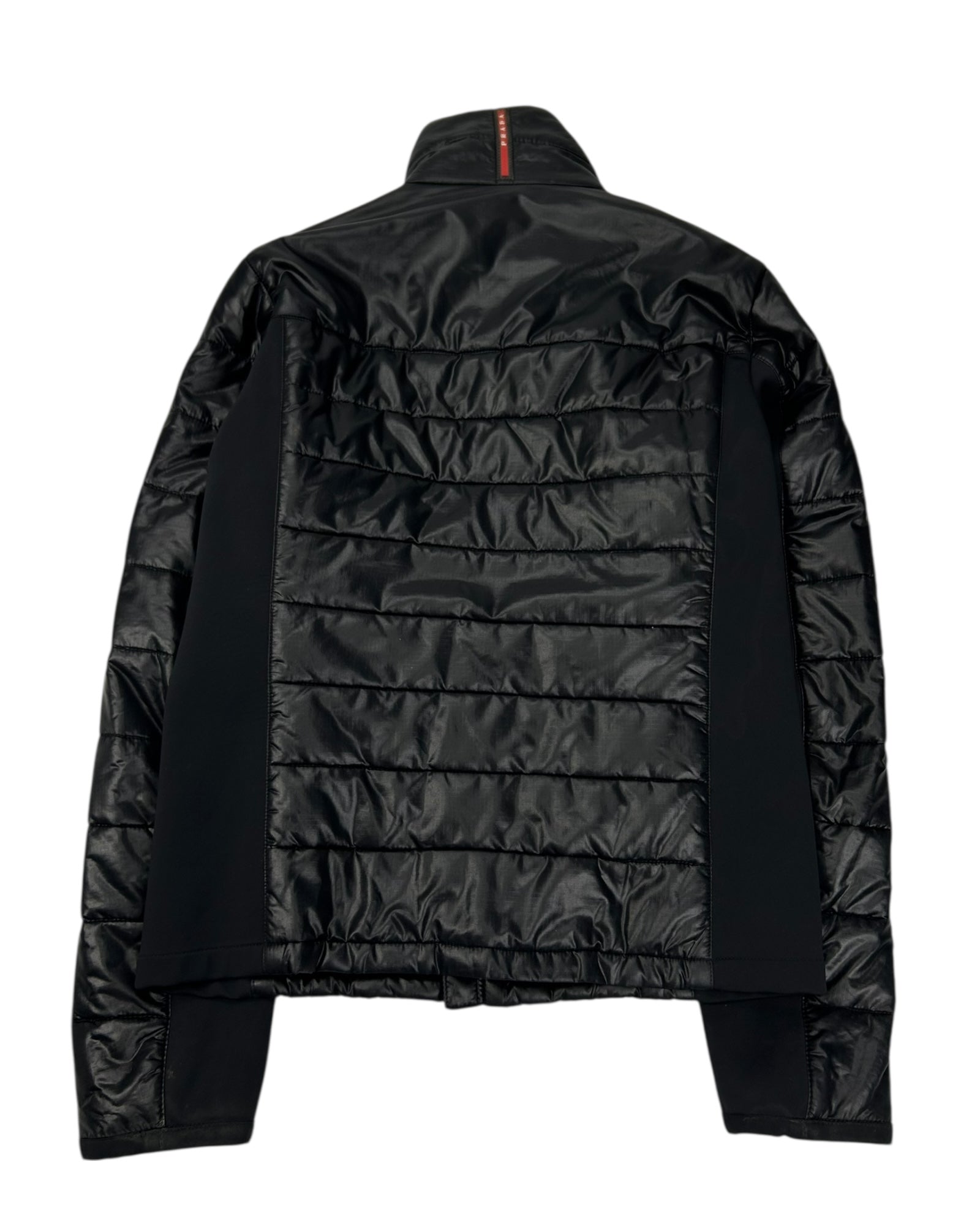 Doudoune Prada en duvet, de couleur noire, en bon état général avec quelques légères traces d’usure. Étiquette intérieure avec plaque Prada.