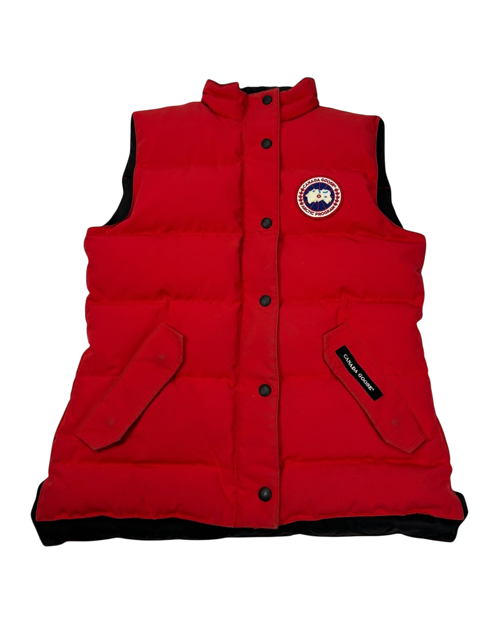 Doudoune sans manches Canada Goose en nylon rouge matelassé, garnissage en duvet pour un bon maintien de la chaleur, col montant fermé par des boutons-pression noirs et écusson Canada Goose brodé sur la poitrine.