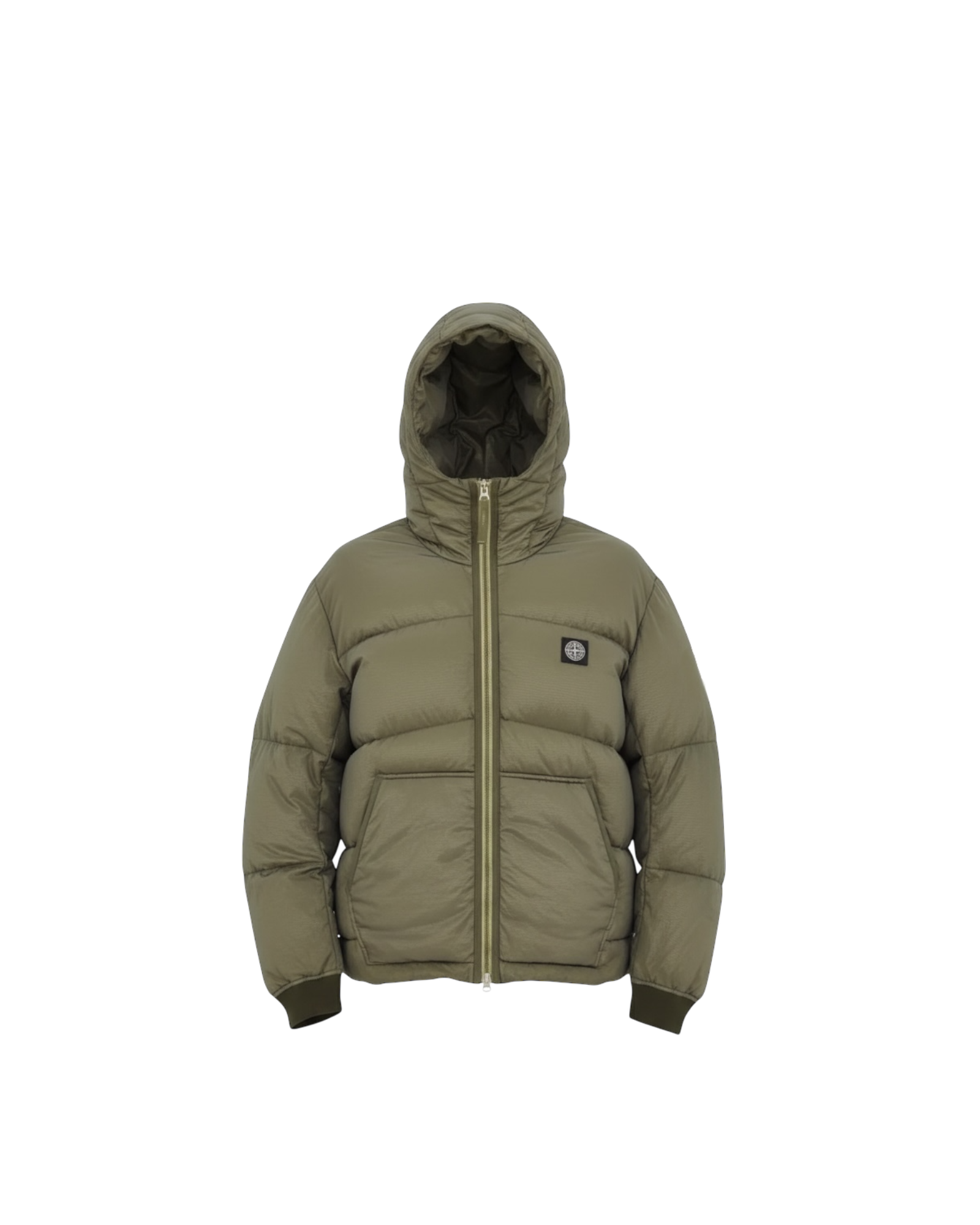 Stone Island doudoune à capuche en tissu technique vert kaki matelassé en boudin horizontal, patch logo Stone Island sur la poitrine gauche, fermeture zipée , plusieurs poches utilitaires à rabat sur les côtés, étiquette de marque et étiquettes techniques cousues à l’intérieur.