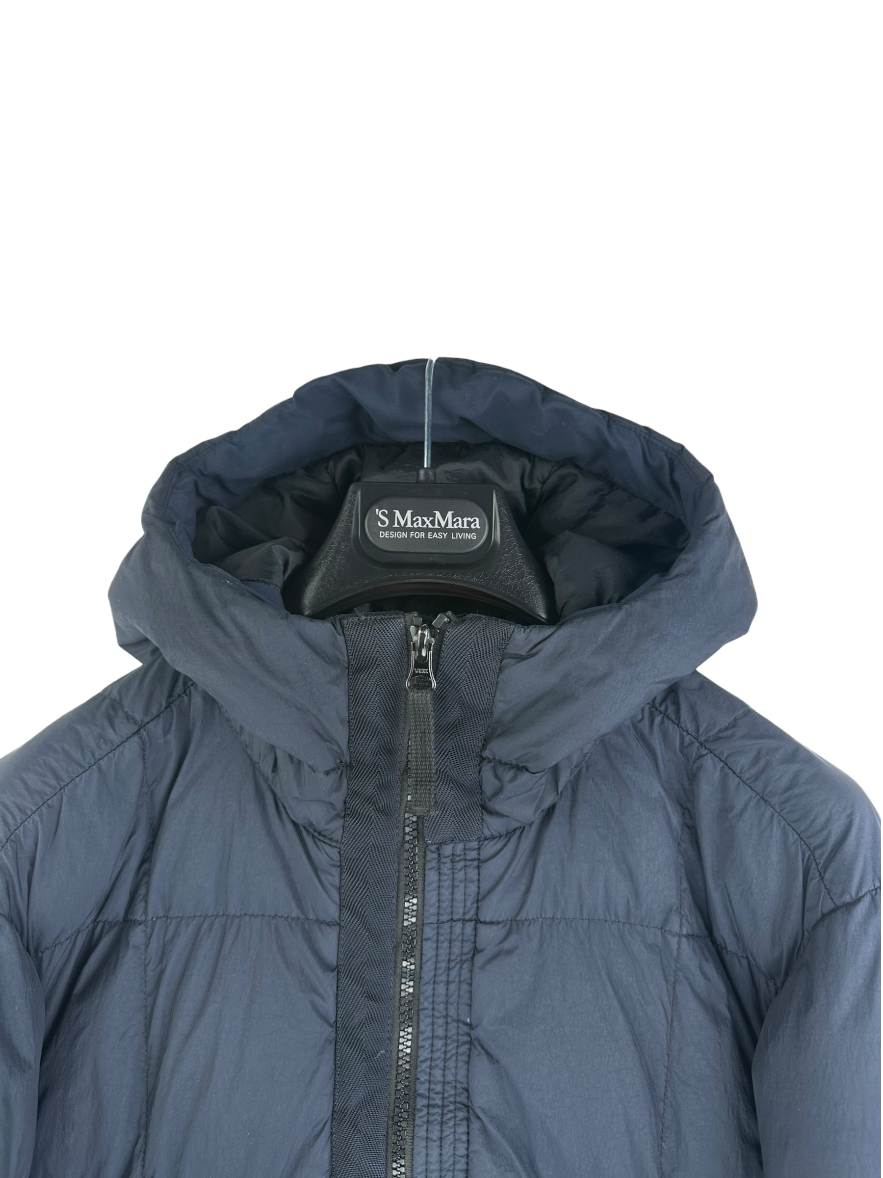 Doudoune à capuche en nylon, badge Stone Island sur la manche, doublure intérieure matelassée, détails de surpiqûres et fermetures éclair noires.