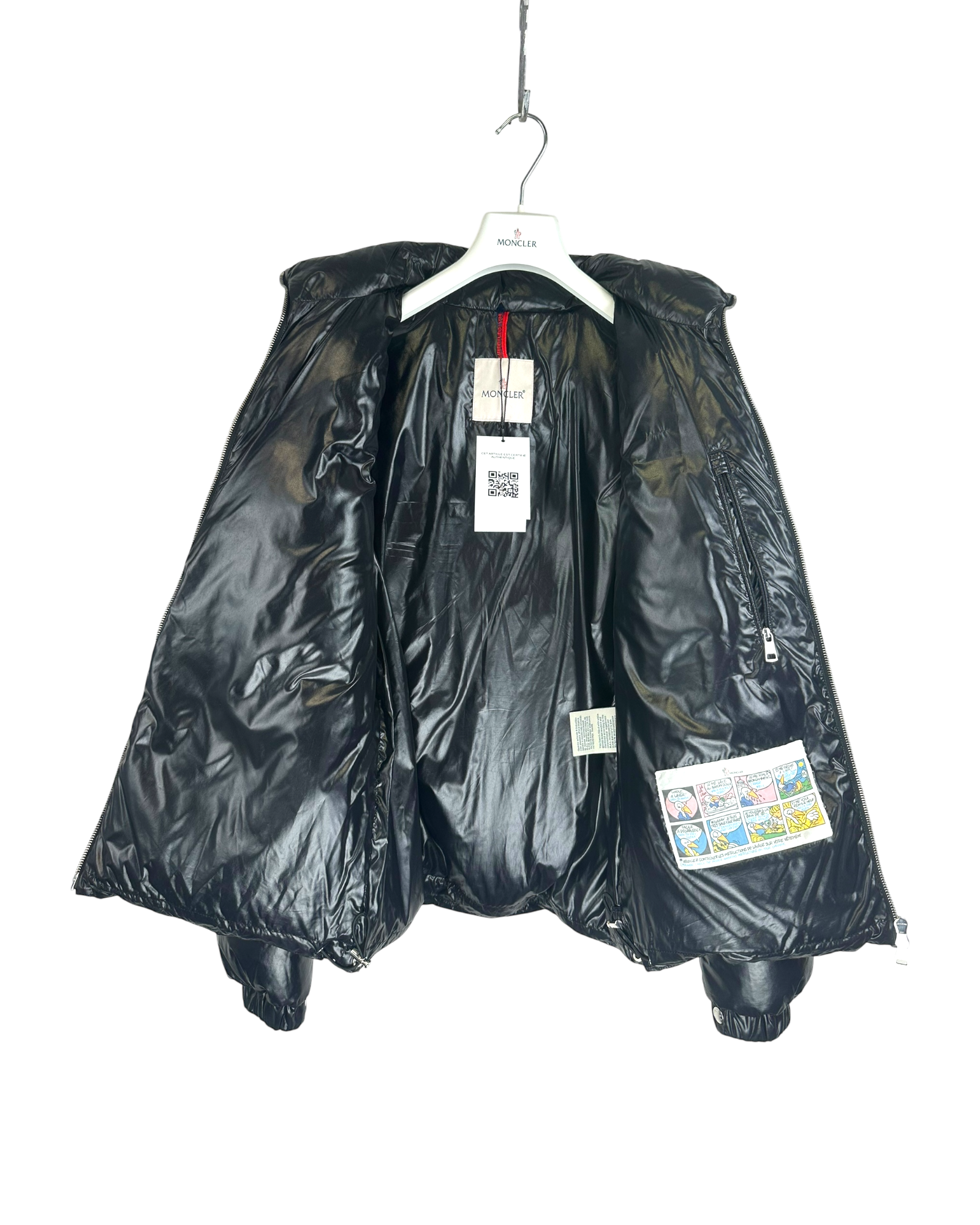 Doudoune courte noir brillant, matelassage en larges boudins horizontaux, col montant, fermeture zippée sous patte pressionnée, poignets élastiques, cordon de serrage au bas, logo Moncler brodé sur la poitrine, doublure et intérieur matelassés ton sur ton, étiquettes intérieures Moncler vintage.