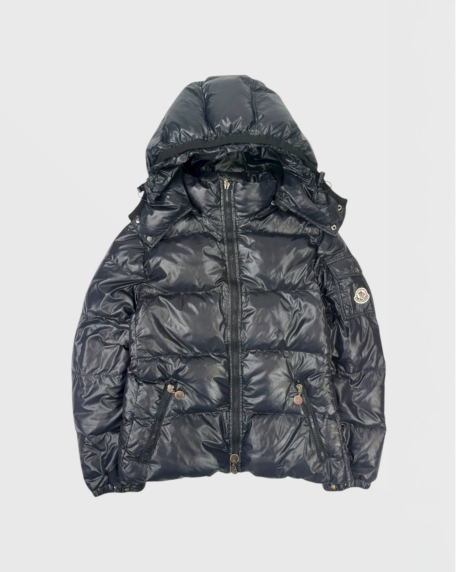 Nylon brillant noir, matelassage horizontal, capuche amovible, badge logo Moncler à la manche, poches zippées sur le devant, fermeture à glissière double curseur, bouton pression aux manches.