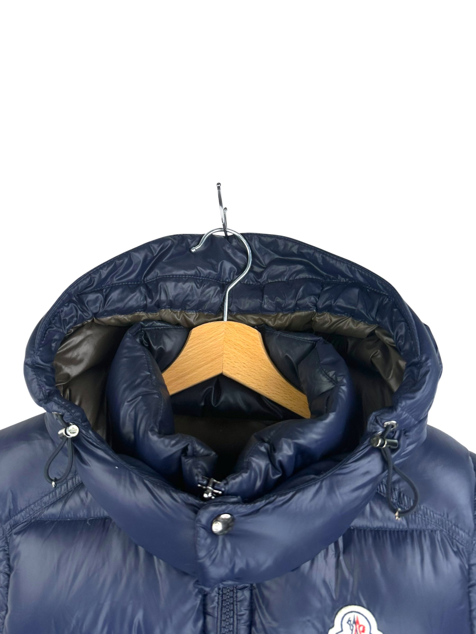 Nylon marine brillant, matelassage horizontal, capuche intégrée, deux poches zippées, fermeture à glissière, logo Moncler brodé sur la poitrine gauche, bande dessinée signature à l'intérieur.