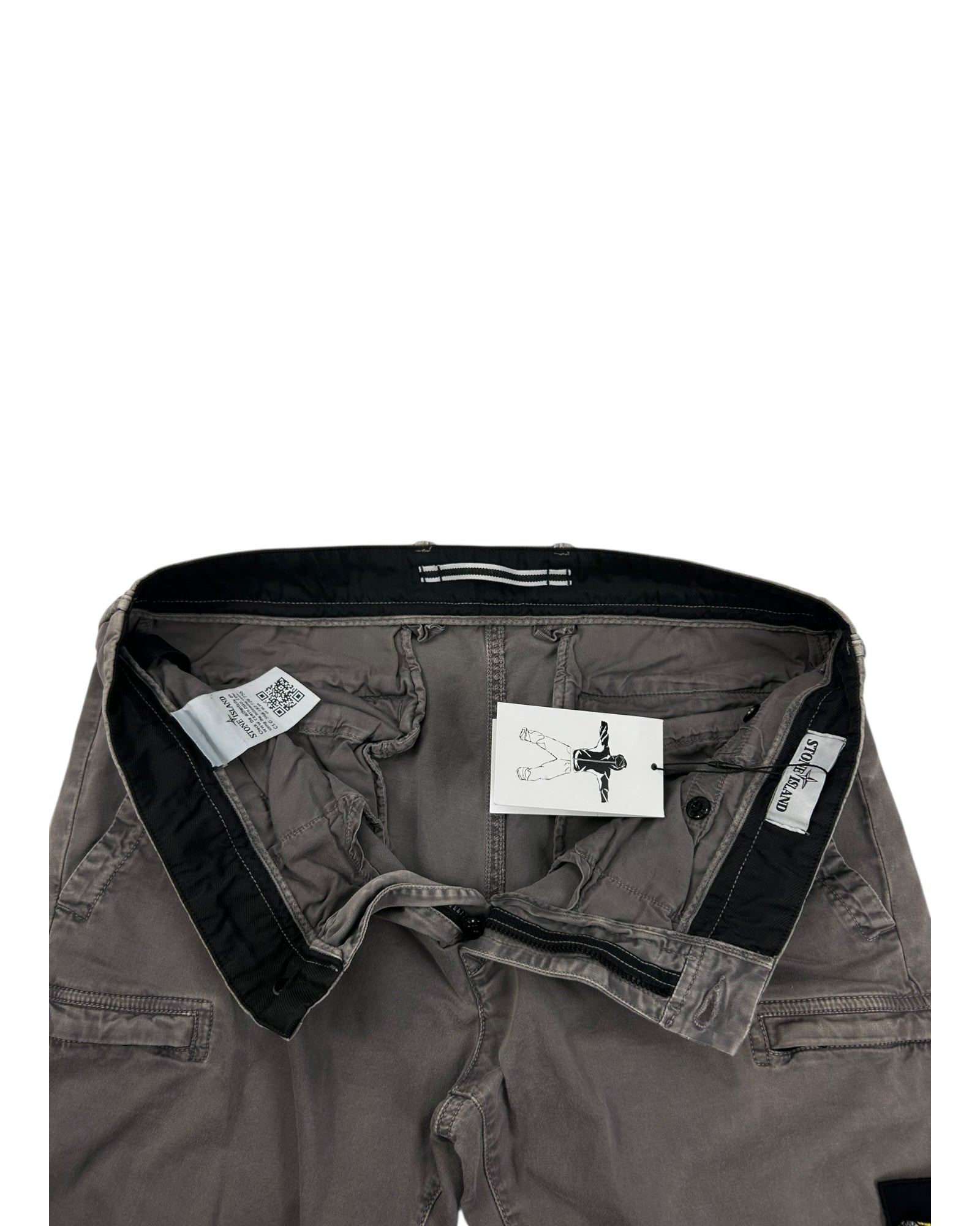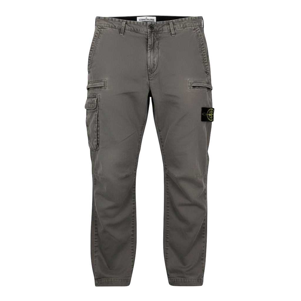 Pantalon cargo en toile de coton gris, coupe fuselée, poches italiennes à l’avant, poches arrière passepoilées, grandes poches cargo latérales à rabat et bouton, patch logo Stone Island brodé détachable sur la poche cargo gauche, fermeture zippée + bouton, passants de ceinture, finitions ton sur ton.
