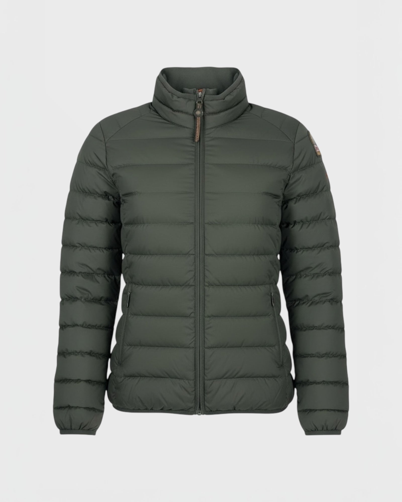 Matelassage horizontal, badge brodé Parajumpers sur la manche, fermeture zippée à double curseur, doublure intérieure beige, tirette orange signature, col montant.