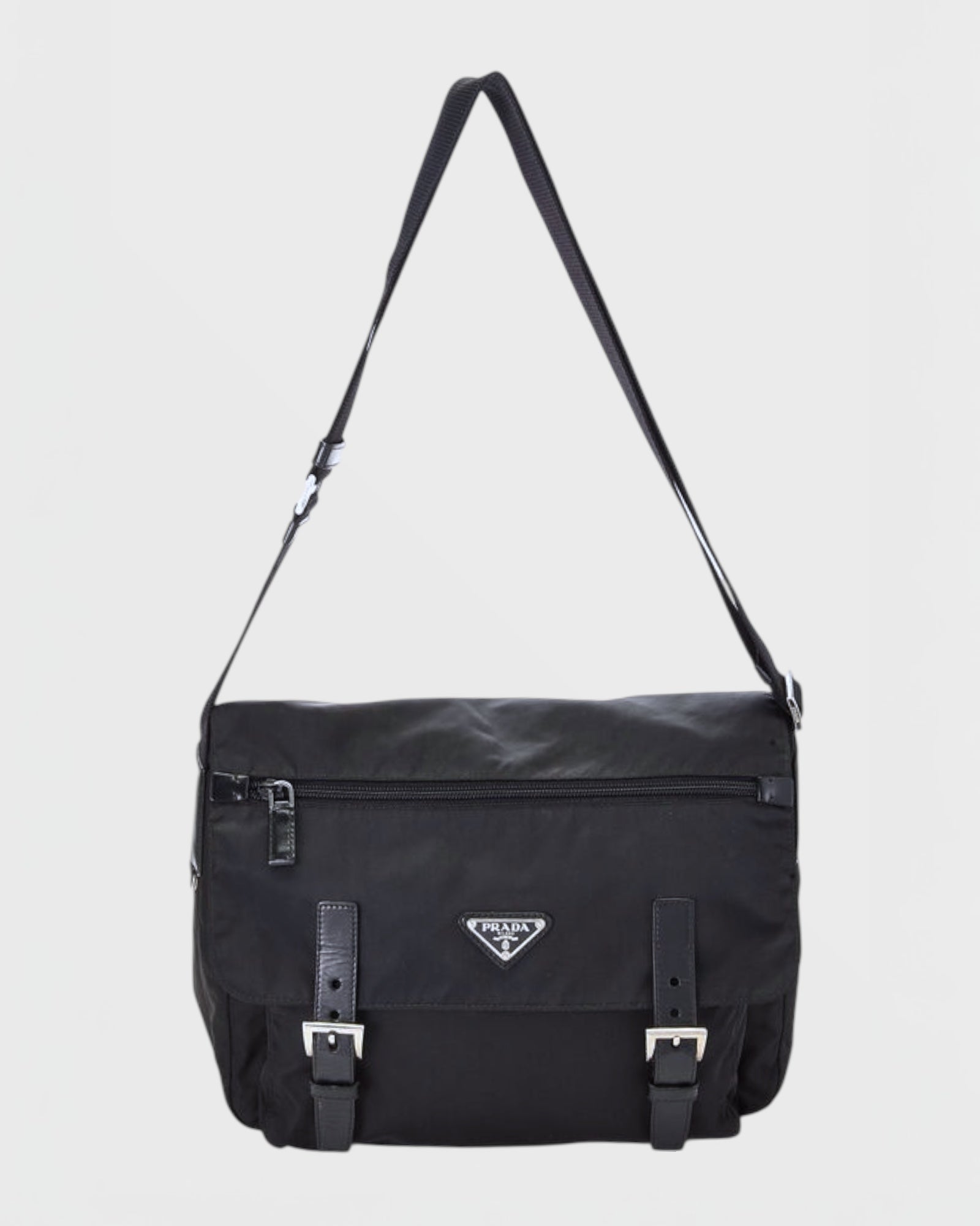 Nylon noir, boucles et détails en cuir noir, bandoulière ajustable, logo triangulaire, rabat à fermetures à boucles, poche zippée à l'arrière.