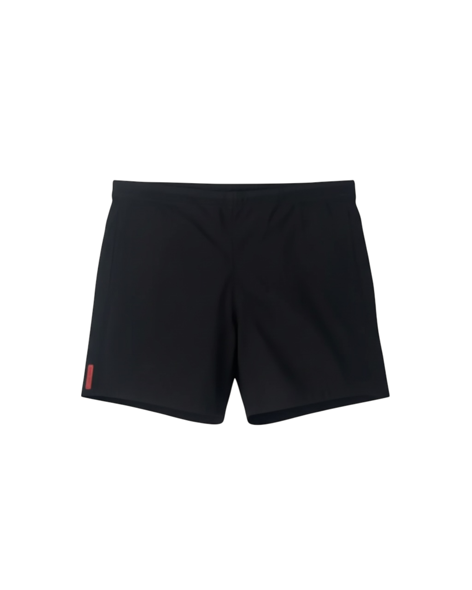 Tissu lisse noir, poche latérale discrète, étiquette rouge sur le bas gauche, taille élastique avec cordon interne, doublure intérieure légère, design minimaliste et fonctionnel.