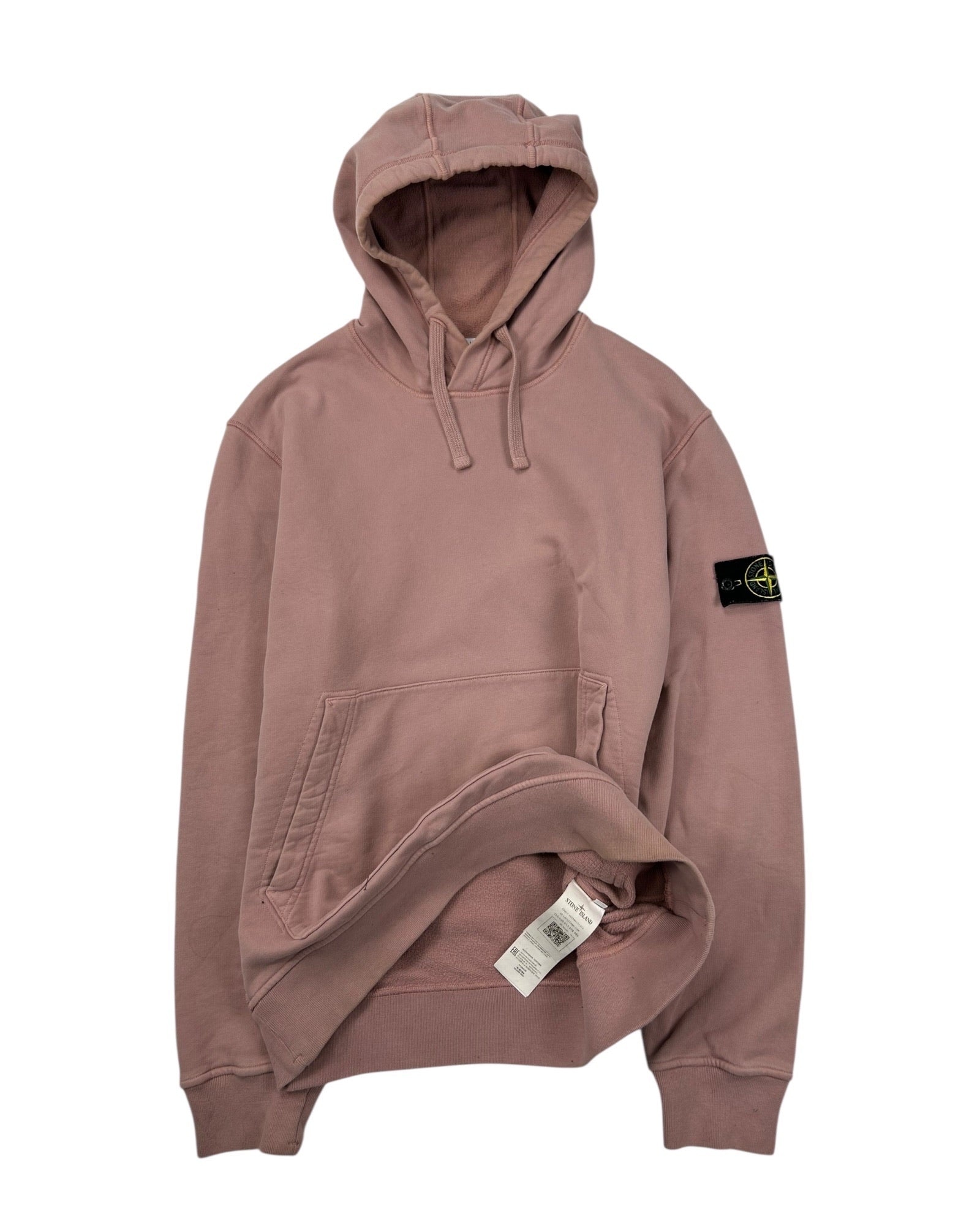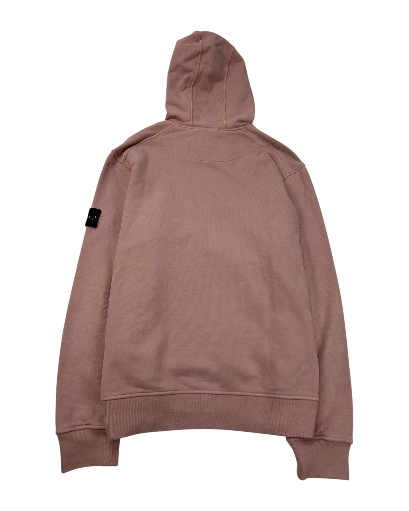 Sweatshirt rose en coton, patch Stone Island noir/jaune cousu sur la manche gauche, coupe classique, détails côtelés au col, manches et taille.