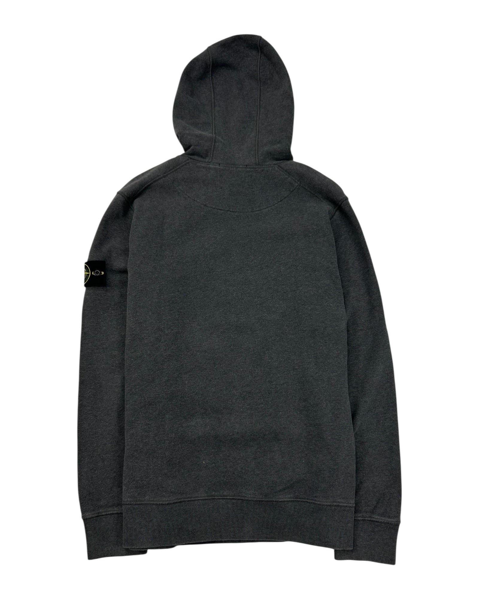 Sweatshirt gris en coton, patch Stone Island noir/jaune cousu sur la manche gauche, coupe classique, détails côtelés au col, manches et taille.