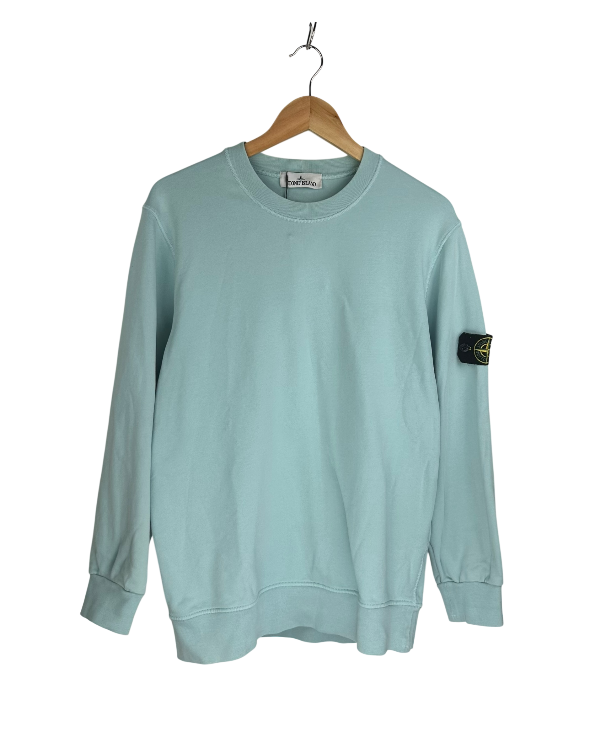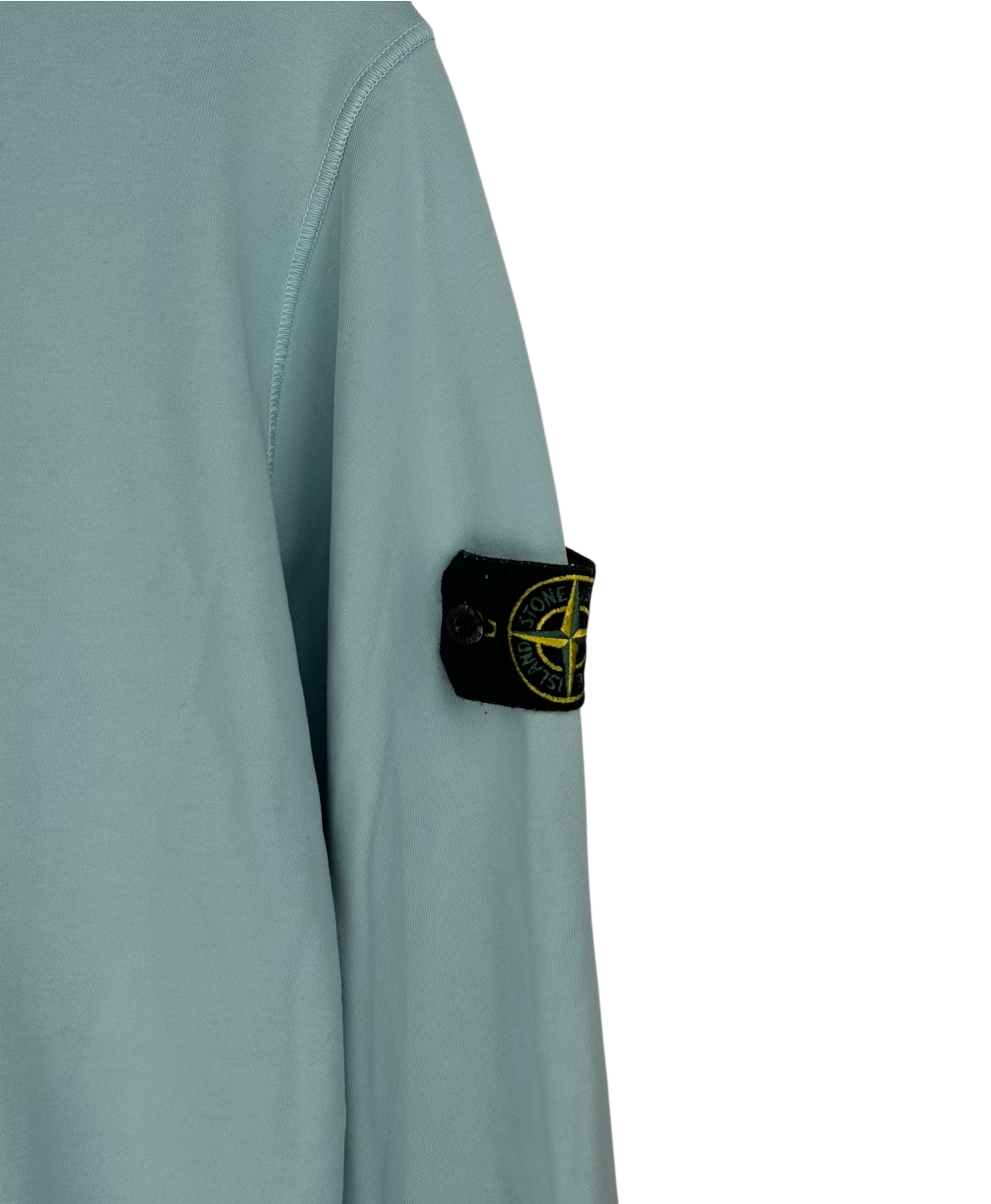 Sweat en coton épais bleu, col rond côtelé, poignets et ourlet en bord-côte, patch signature Stone Island noir avec boussole jaune et verte fixé par boutons sur la manche gauche.