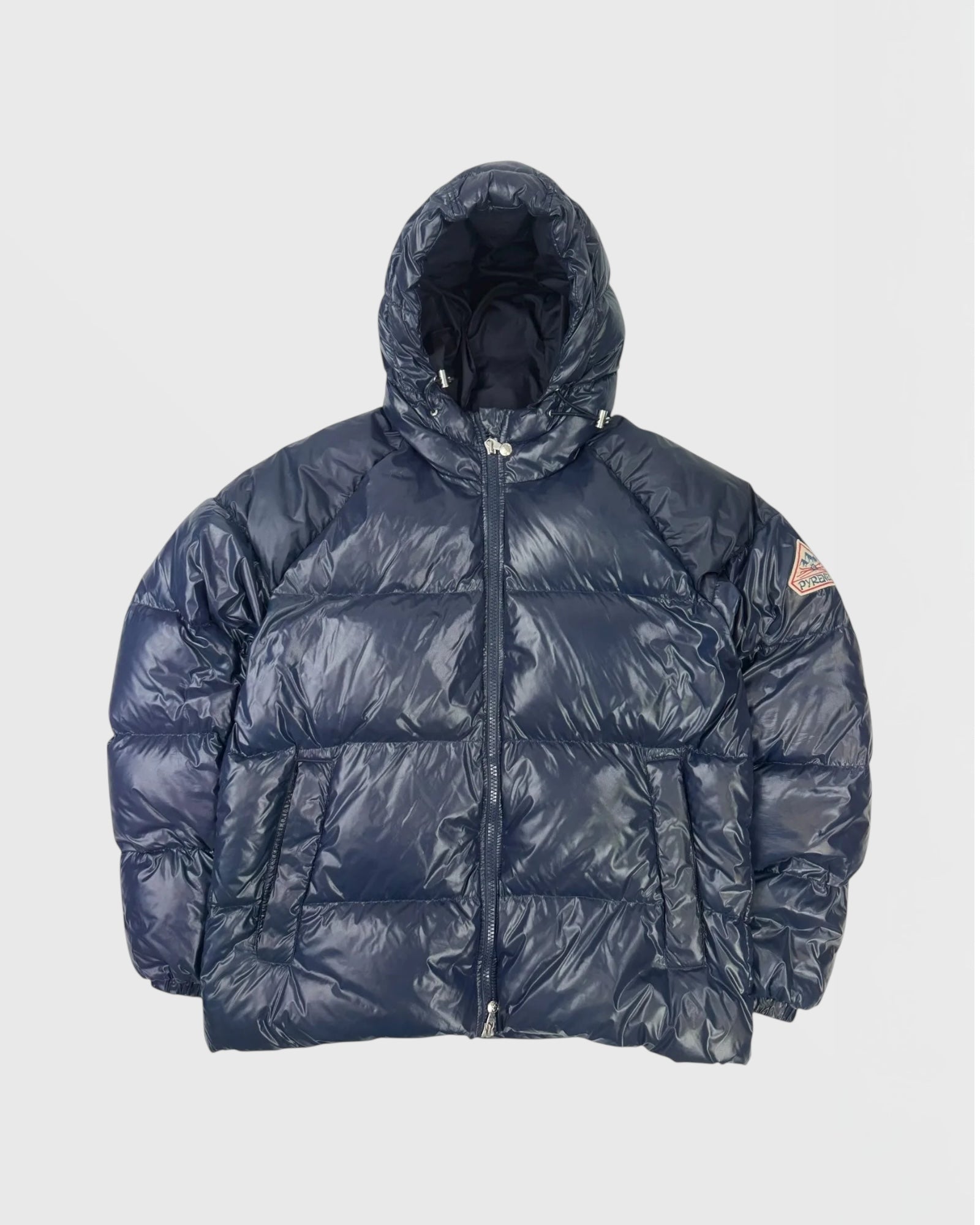 Finition vernie, capuche épaisse, patch logo 'Pyrenex' cousu sur la manche, poches zippées, coupe oversize, matelassage horizontal.