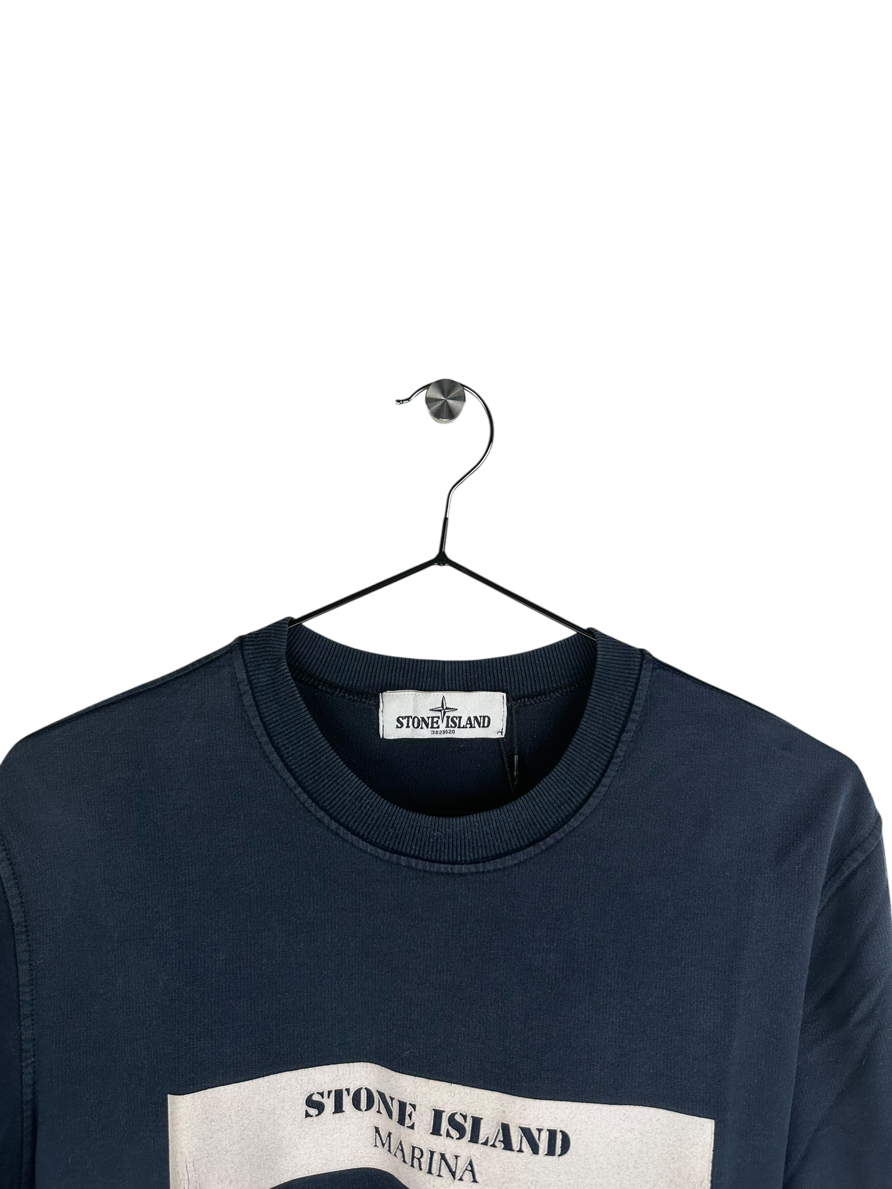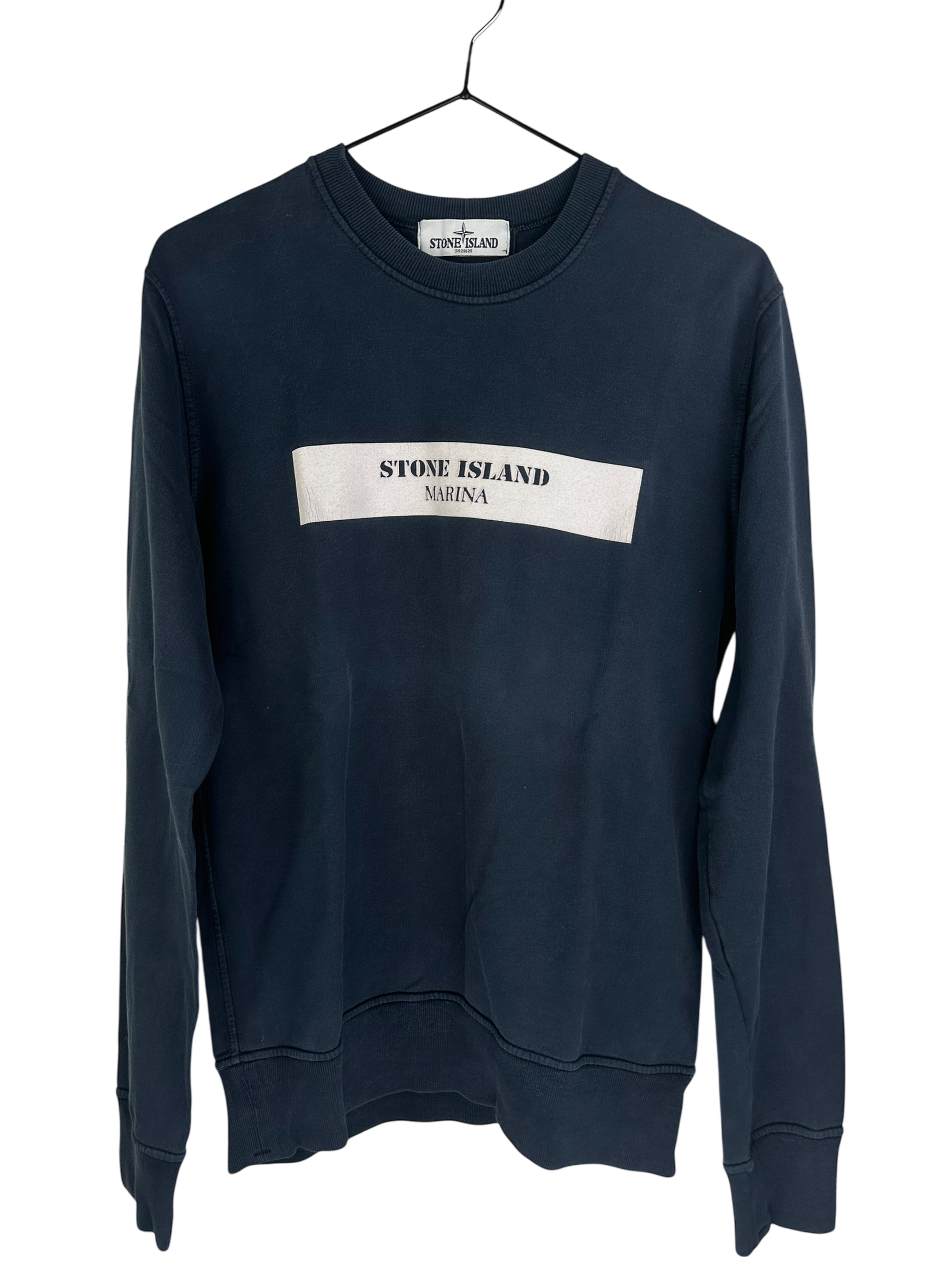 T-shirt à manches longues marine avec le nom de ma marque sur le devant sur une bande blanche.