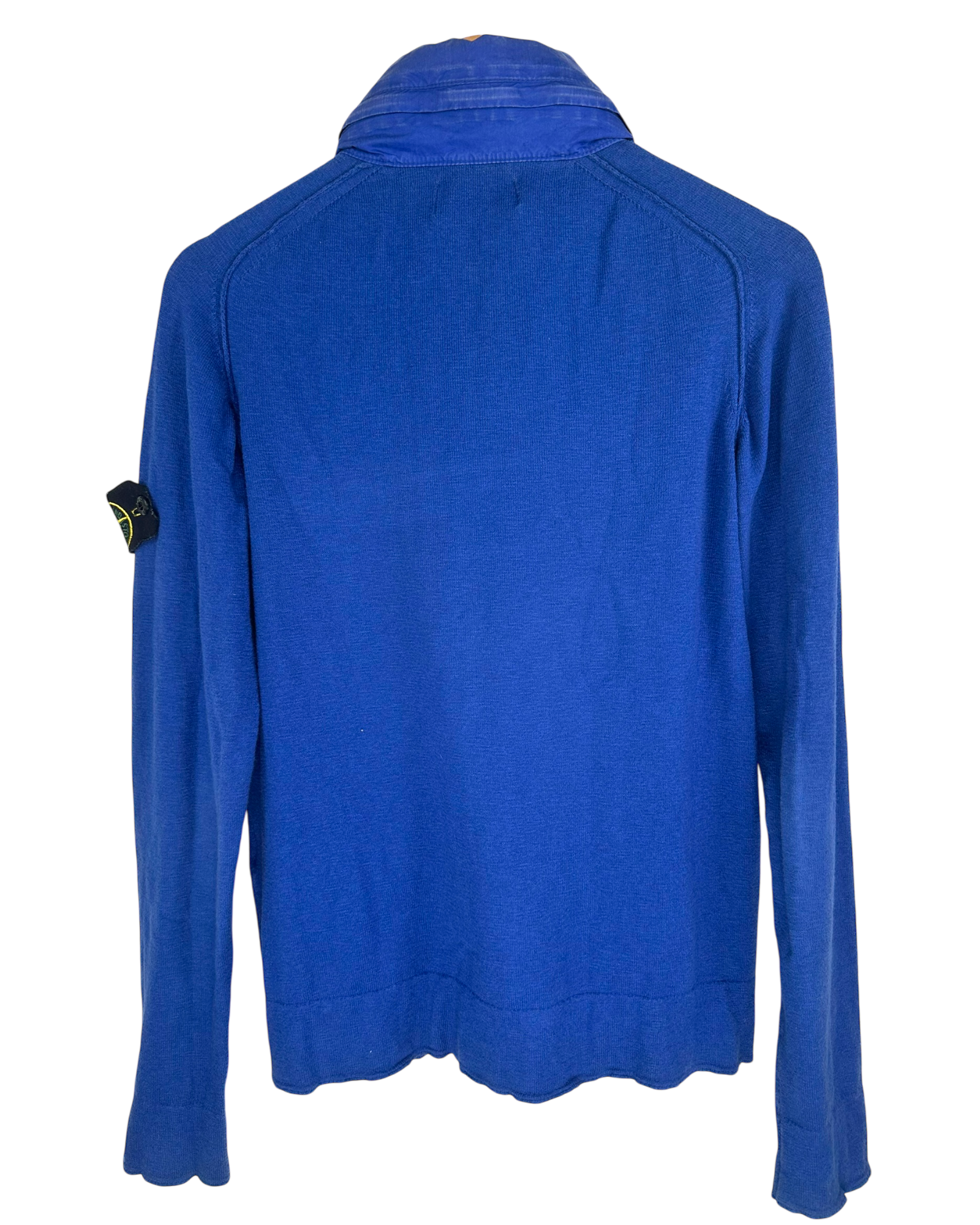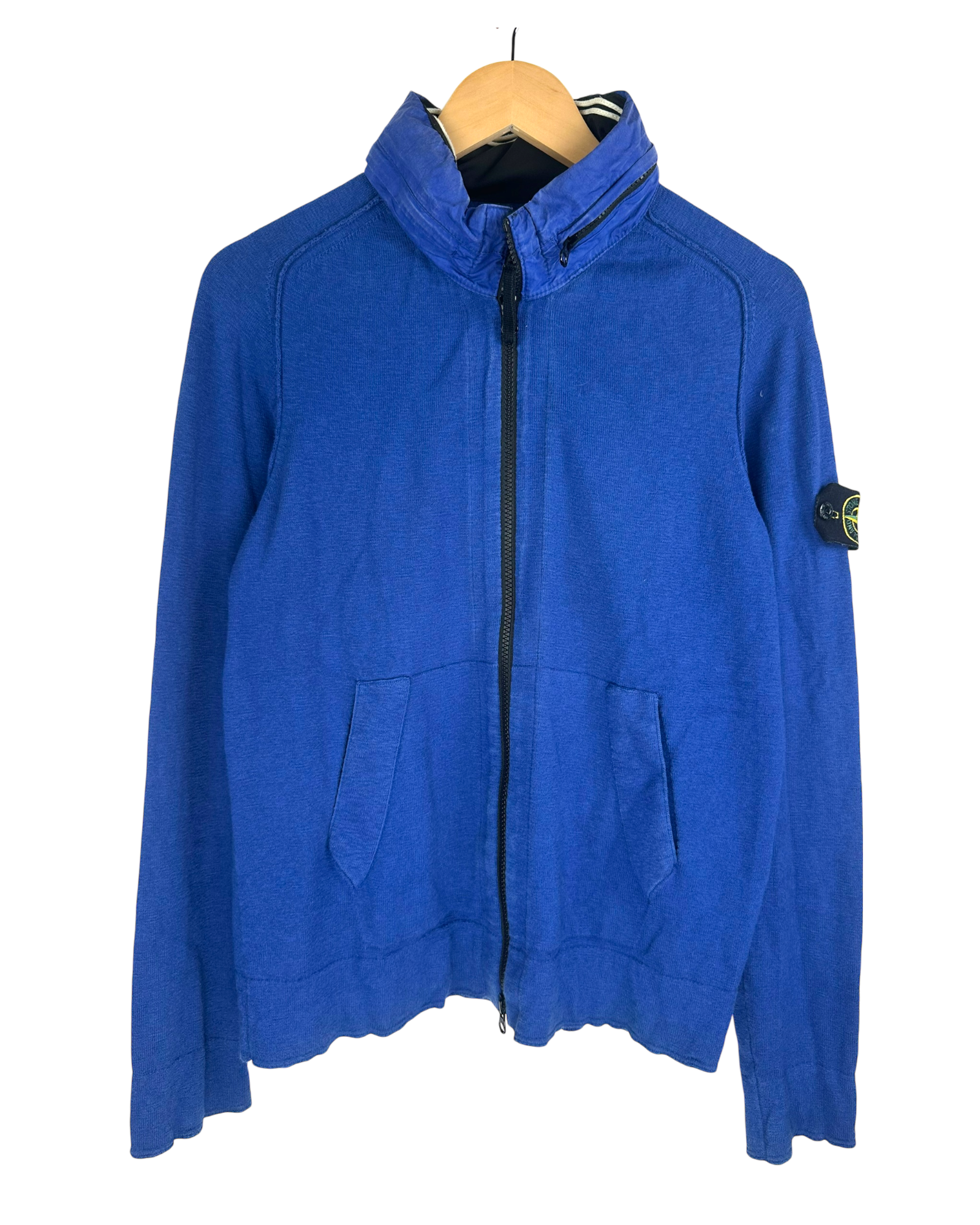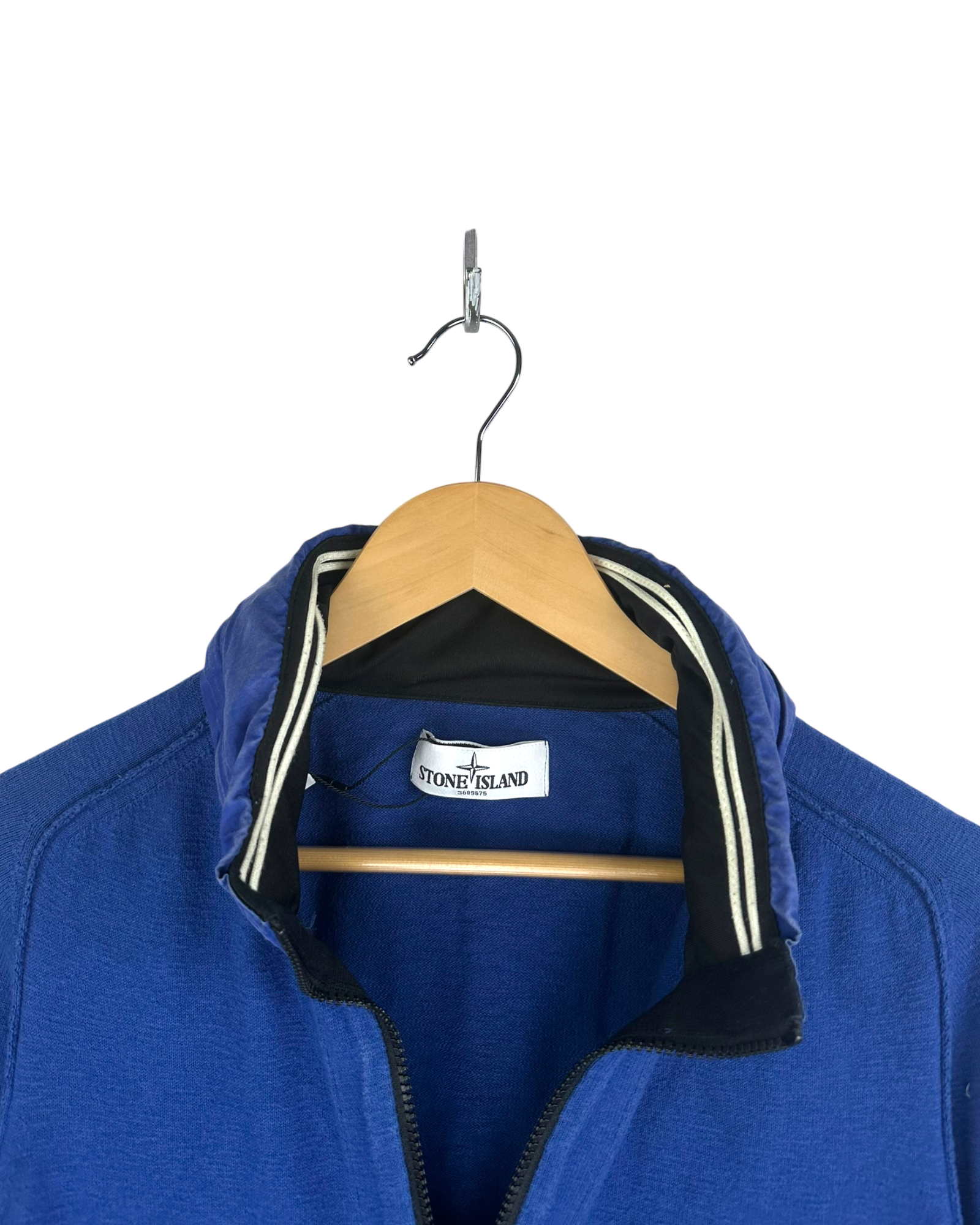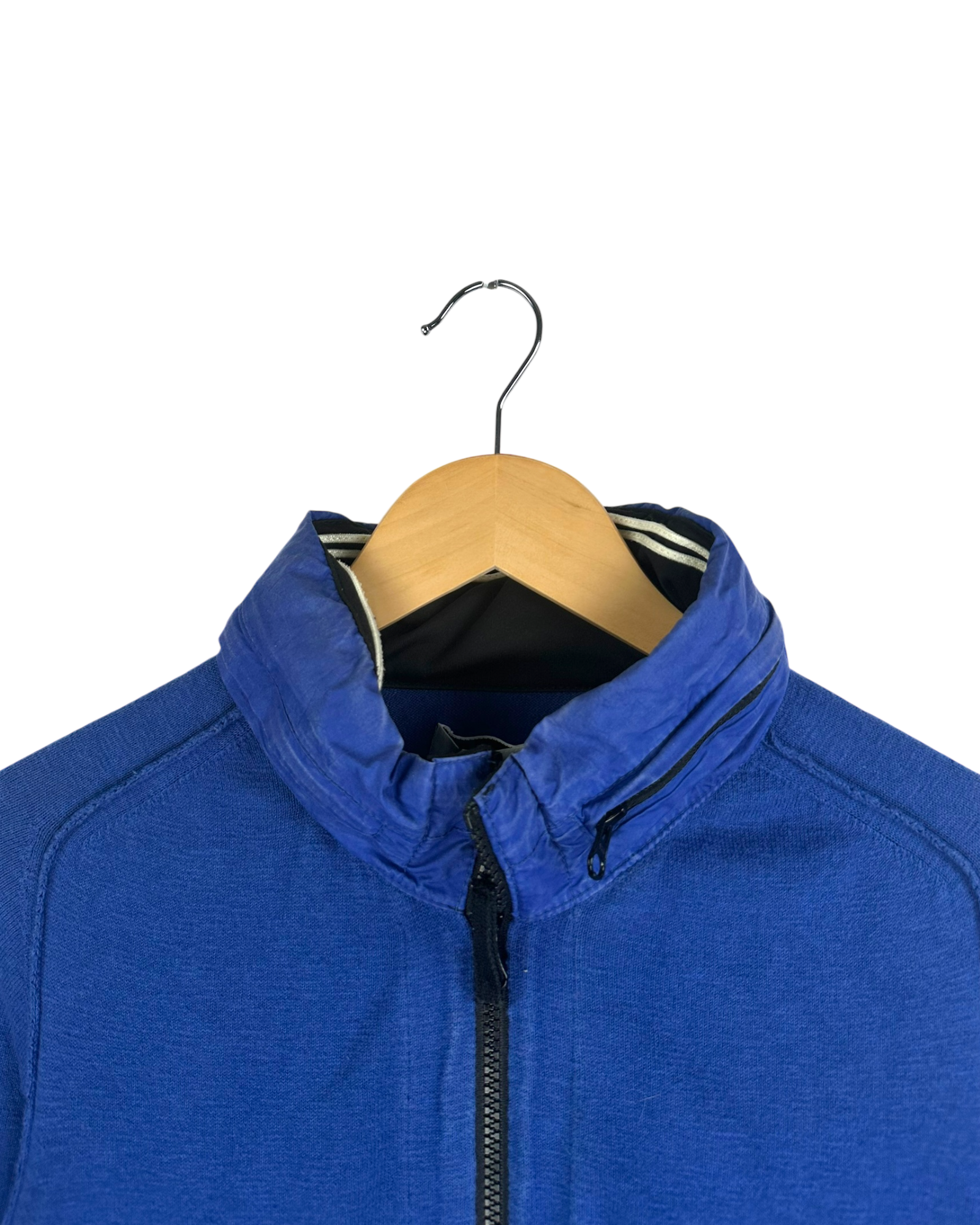 Veste en molleton bleu avec texture piquée type sweat, col montant en nylon matelassé avec liserés contrastants, fermeture zippée pleine longueur, poches zippées à entrée verticale, badge Stone Island brodé sur la manche gauche, poignets et bas en bord-côte, intérieur non doublé avec étiquette Stone Island et étiquette QR code d’authentification.