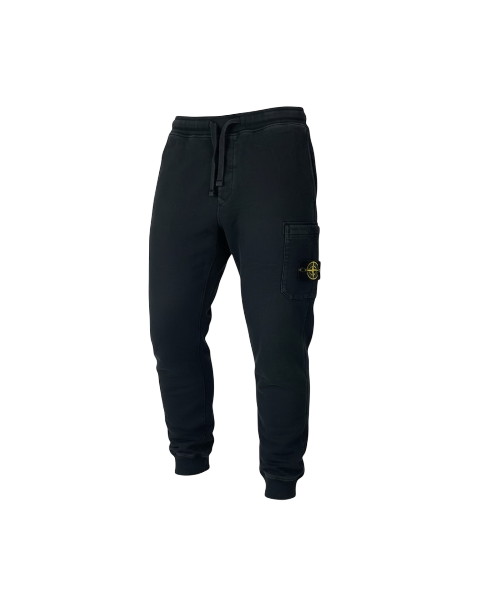 Poche cargo latérale avec patch tissé Stone Island, taille élastiquée avec cordon, poignets resserrés, coton noir, étiquette de marque à l'intérieur.