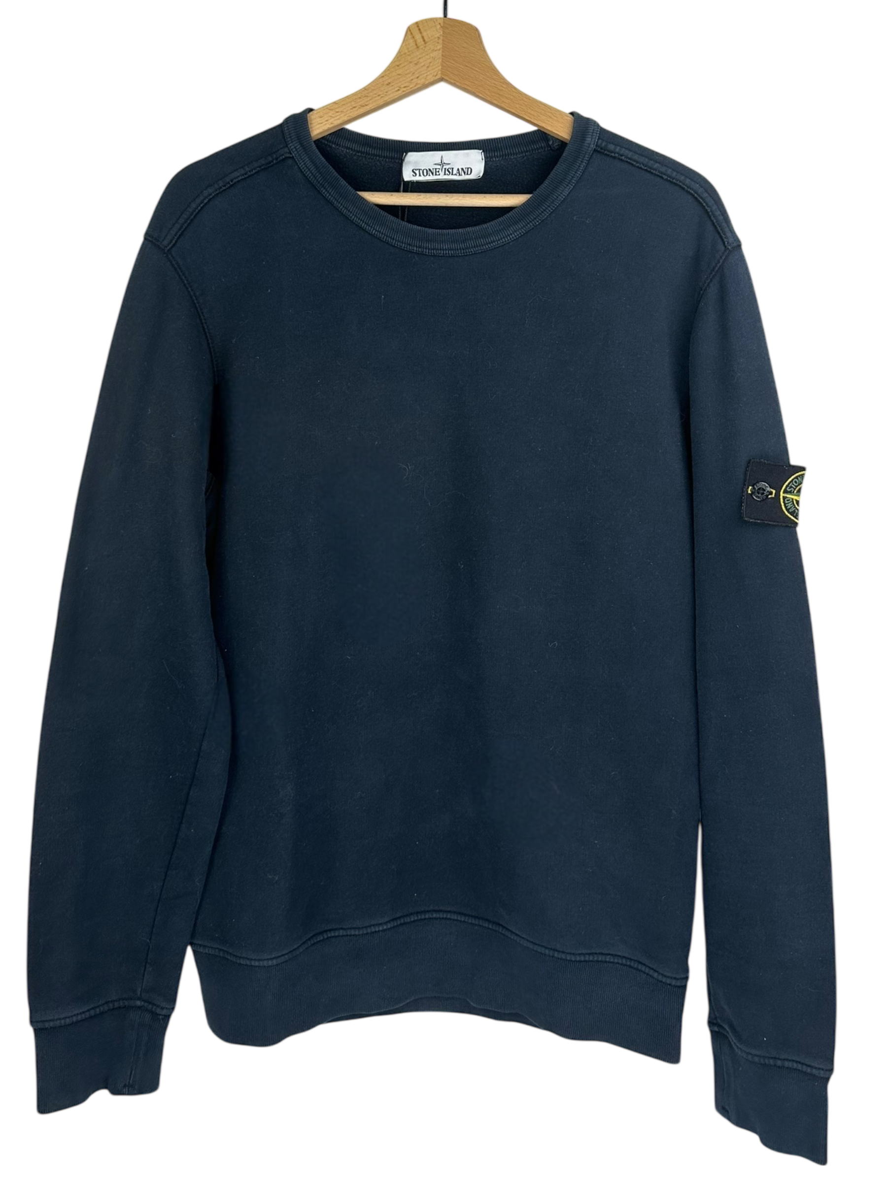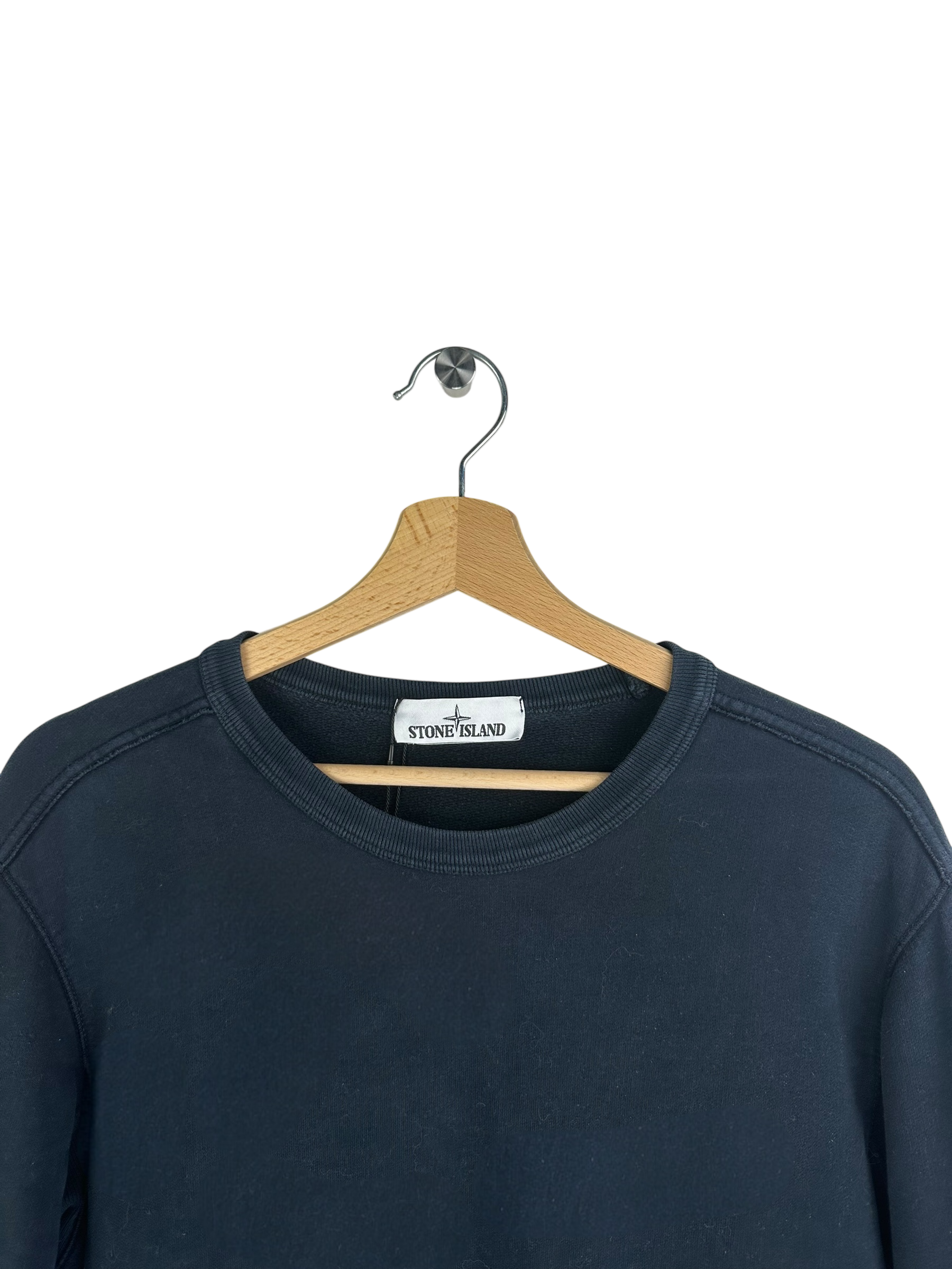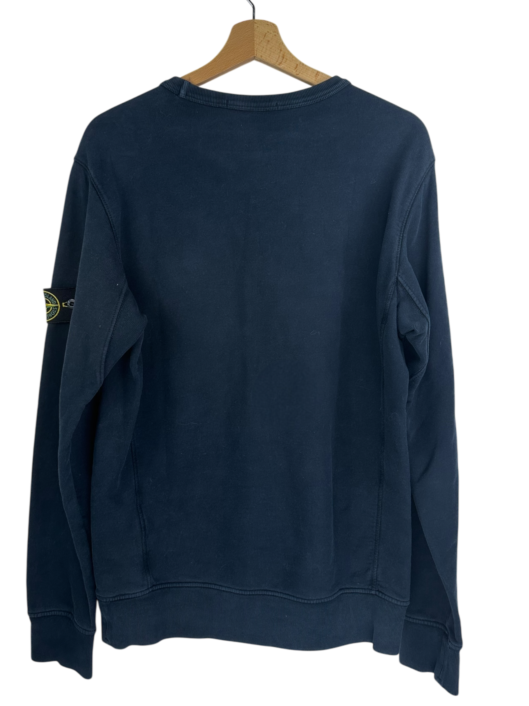 Sweat en coton bleu marine à col rond, badge Stone Island boussole sur la manche gauche, bord-côtes au col, aux poignets et à la taille, dos uni, intérieur molletonné léger, style minimaliste sans impression ni motif supplémentaire.