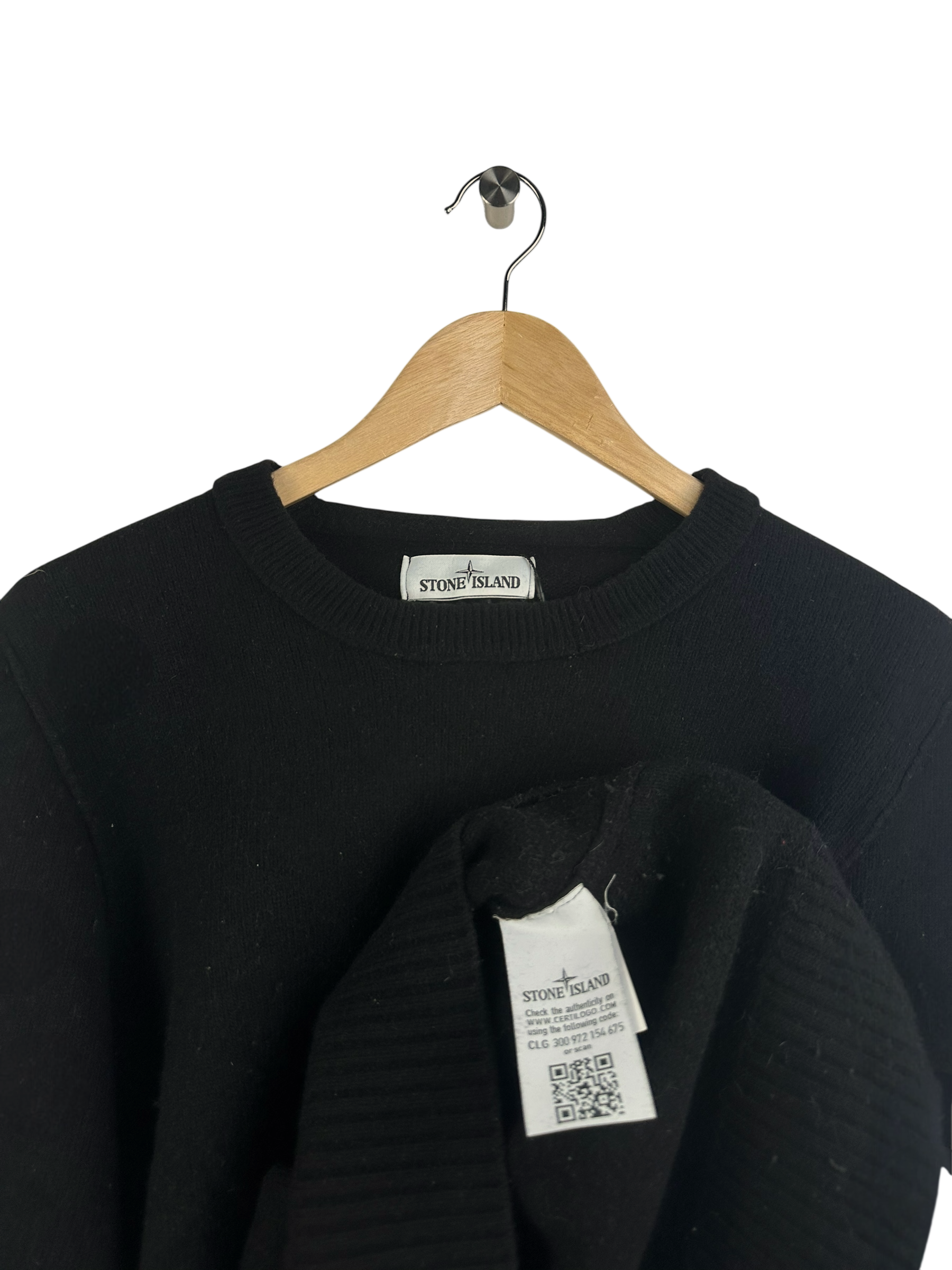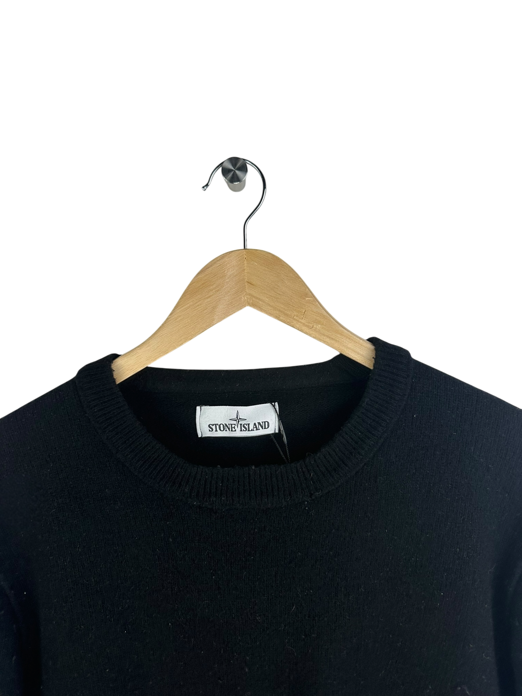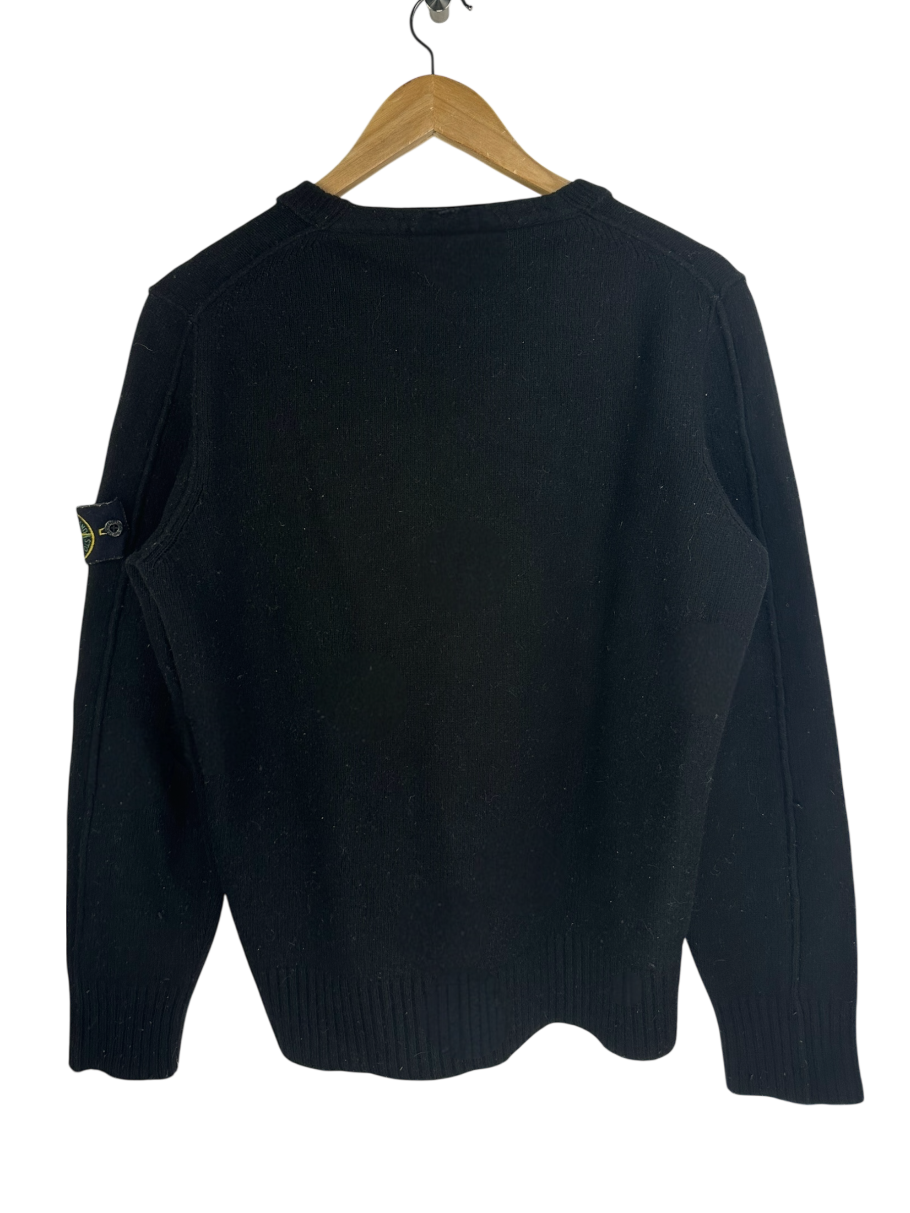 Pull col rond en maille fine noir, bord-côte au col, poignets et ourlet, patch logo Stone Island amovible sur la manche gauche, dos uni sans motif, maille serrée de type laine ou mélange laine.