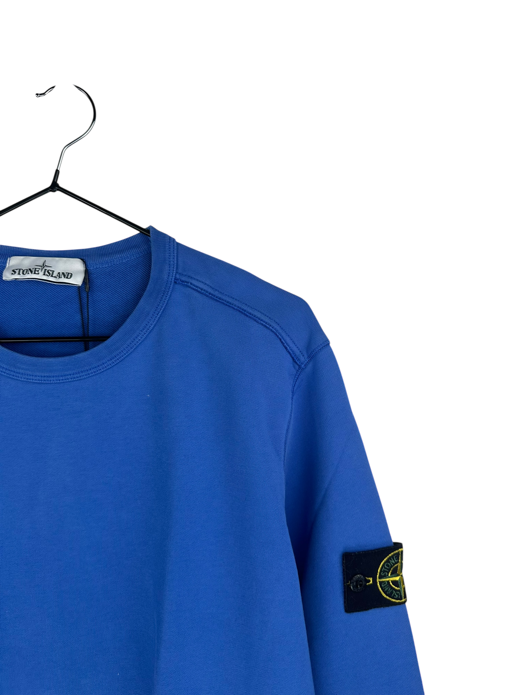 Pull épais en coton bleu. Avec le patch Stone Island sur la manche gauche.