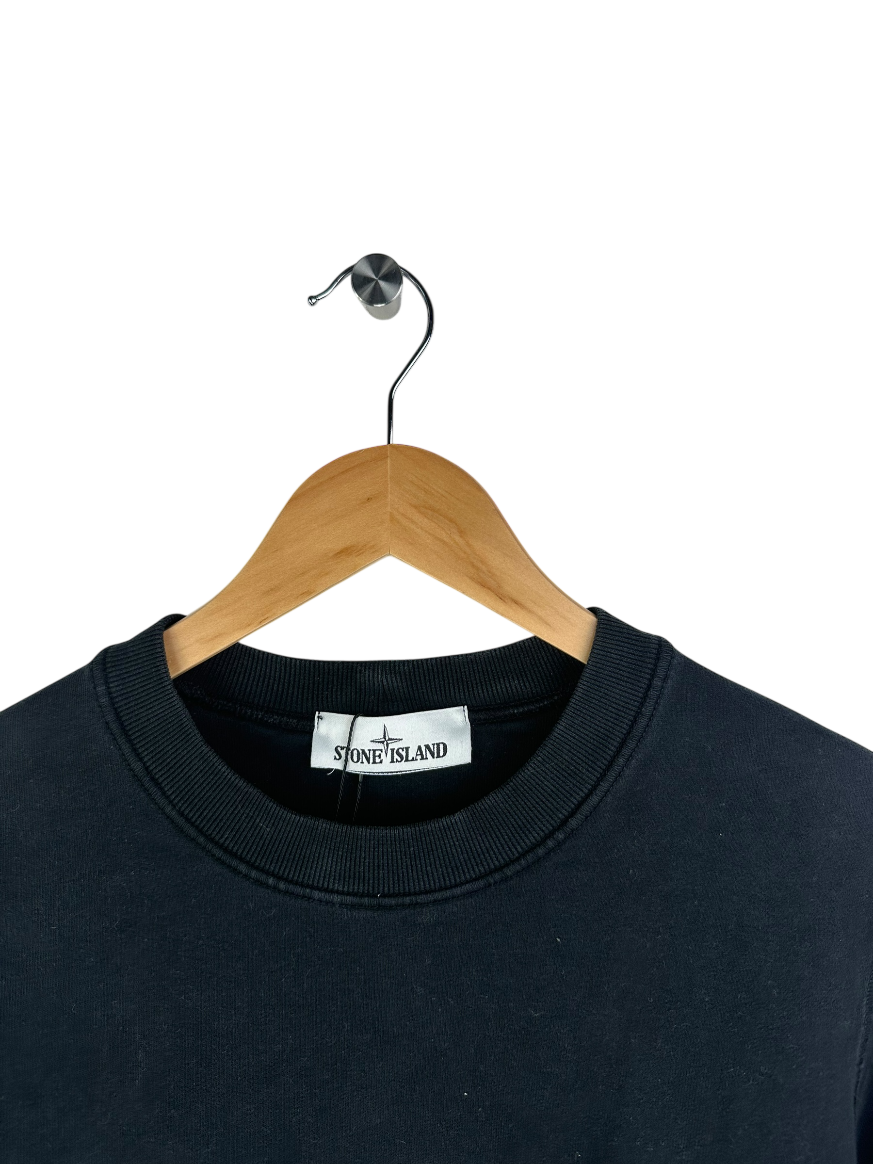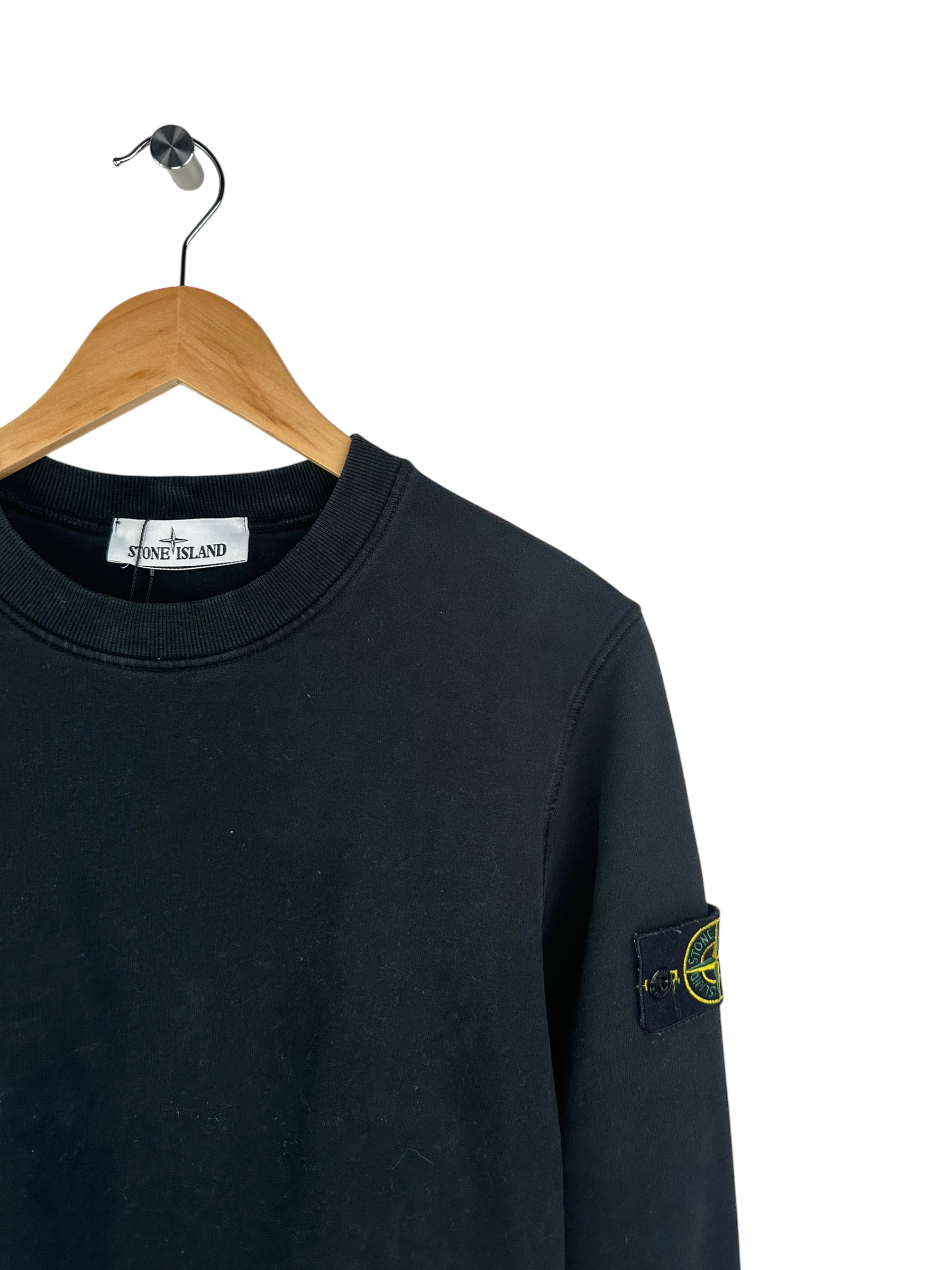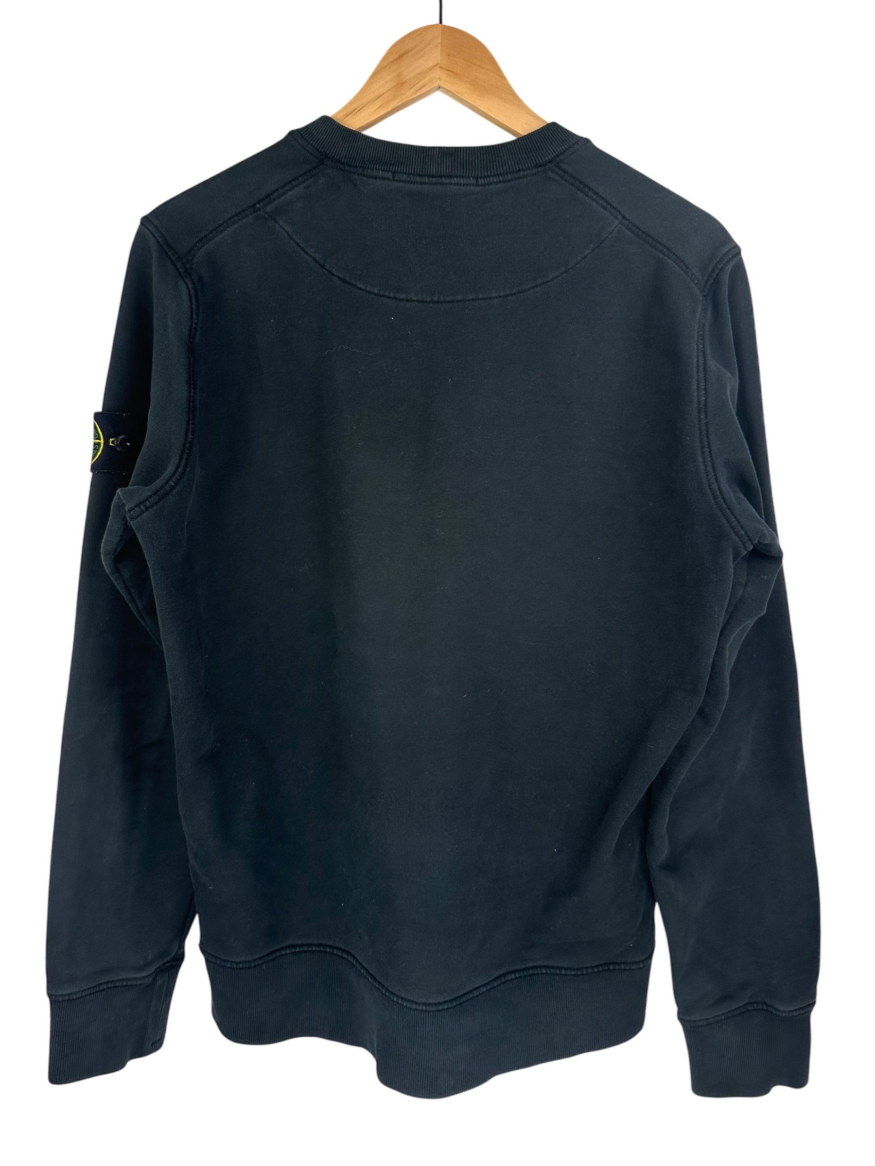 Pull Stone Island noir, avec le patch sur la manche gauche.