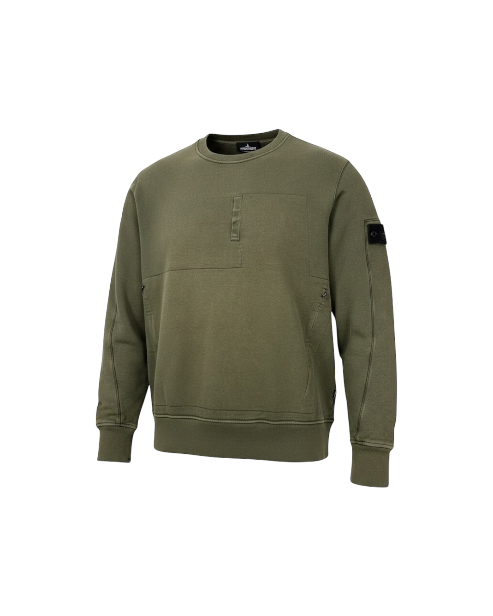 Sweatshirt col rond en coton épais, coloris kaki/vert olive délavé, grande poche plaquée frontale avec patte décorative, poches zippées côté, surpiqûres apparentes, patch logo Stone Island noir sur manche gauche, bord‑côte aux poignets et à la taille, coutures verticales au dos pour un effet technique.