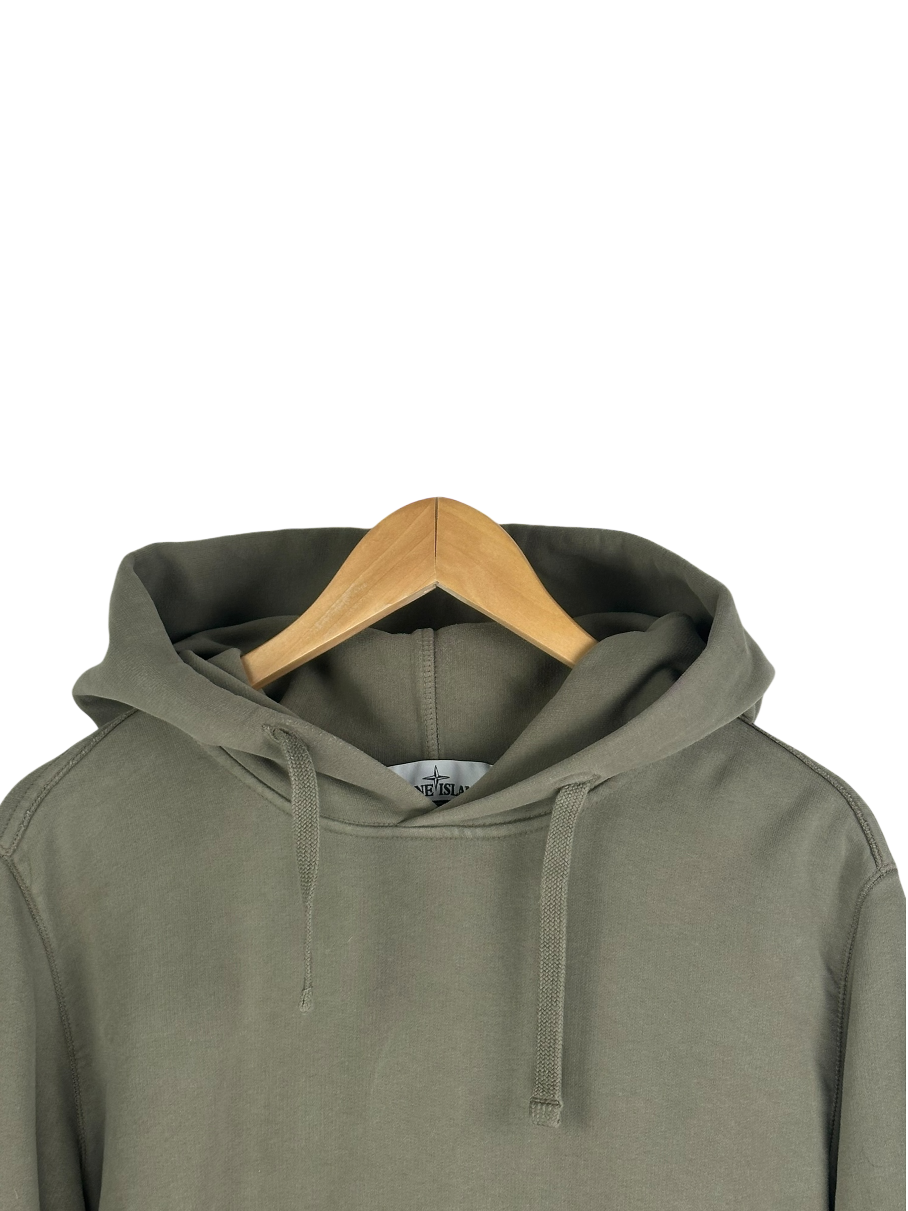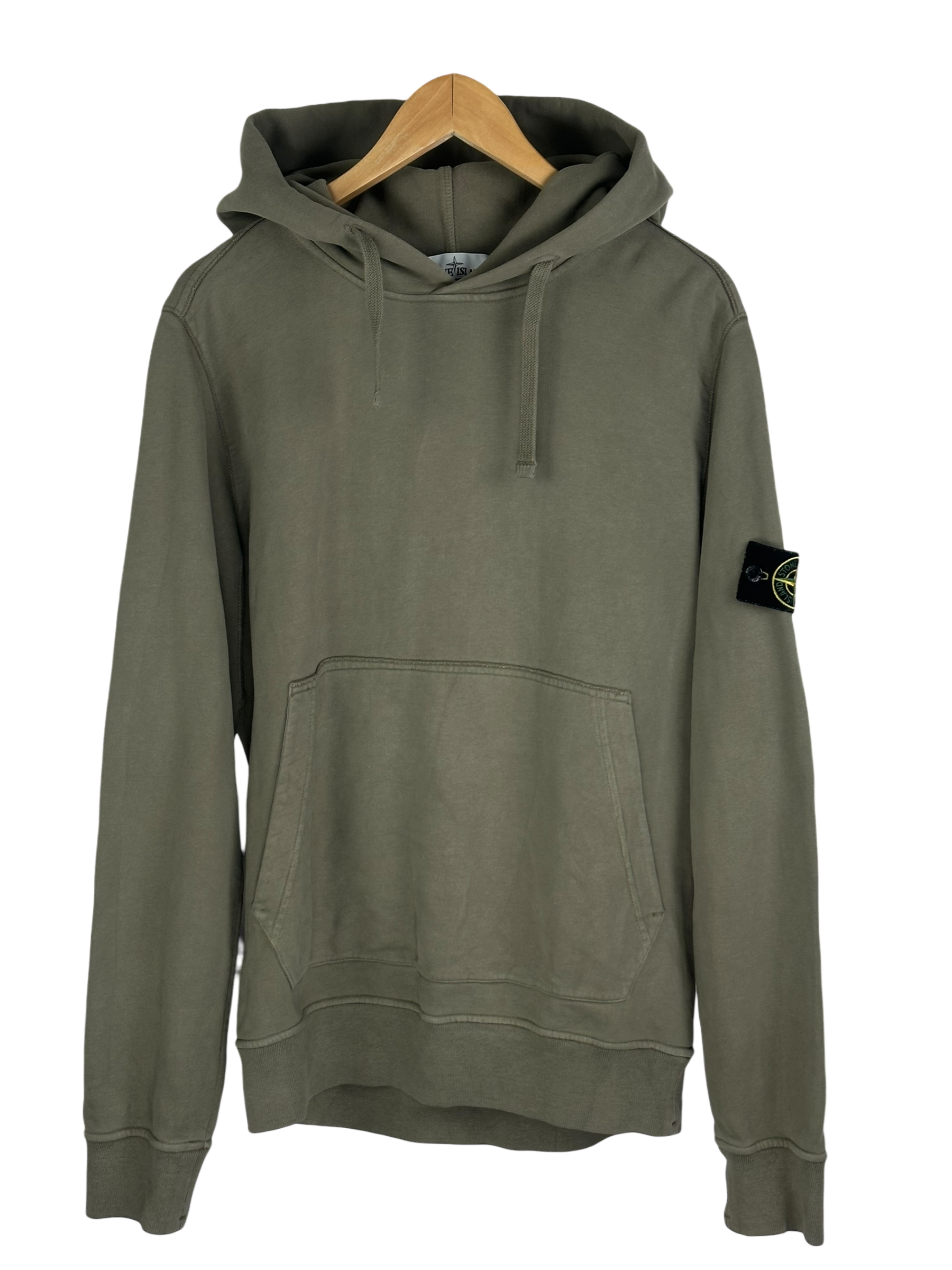 Stone Island pull à capuche kaki en coton, patch Stone Island noir/jaune cousu sur la manche gauche, coupe classique, détails côtelés au col, manches et taille.