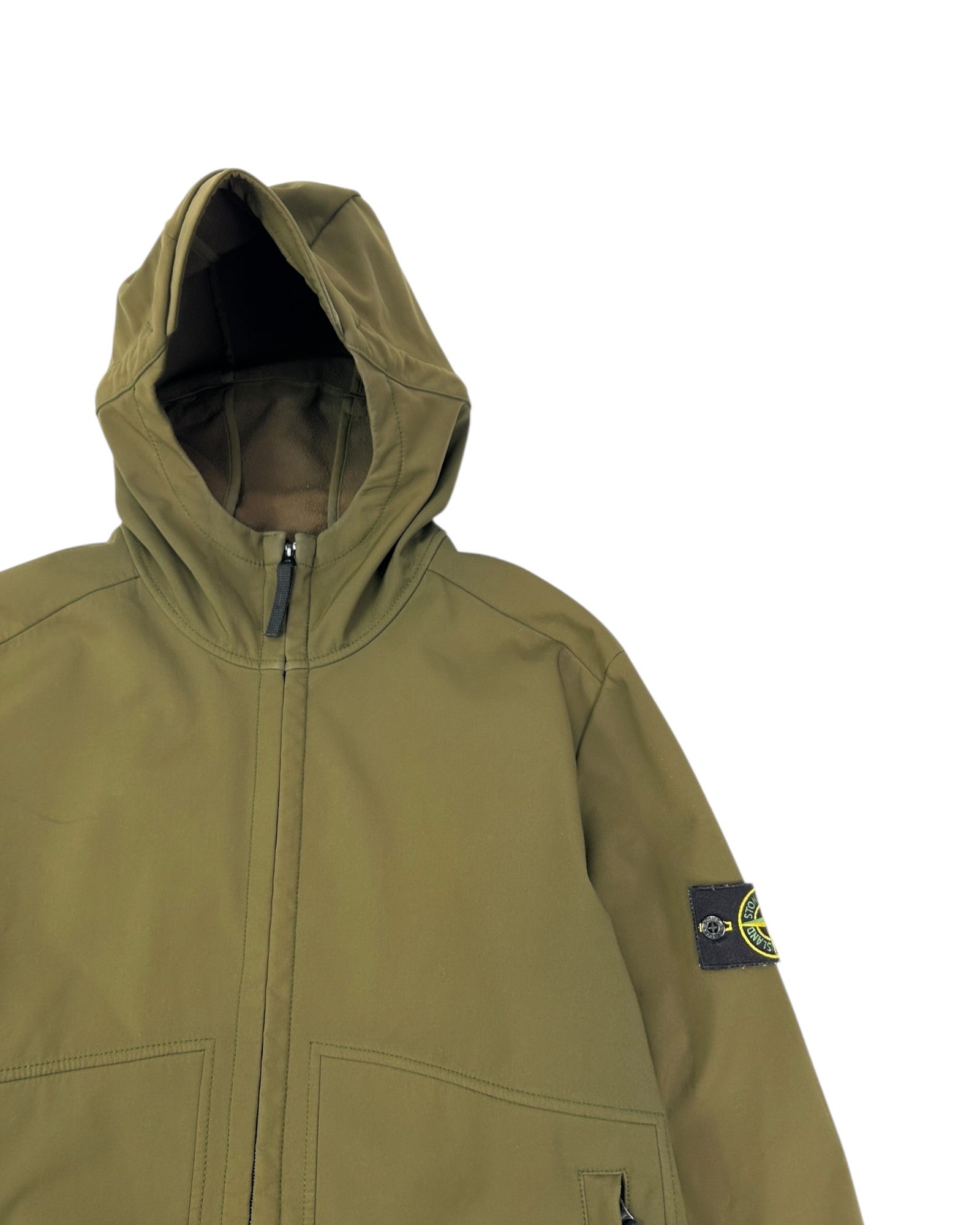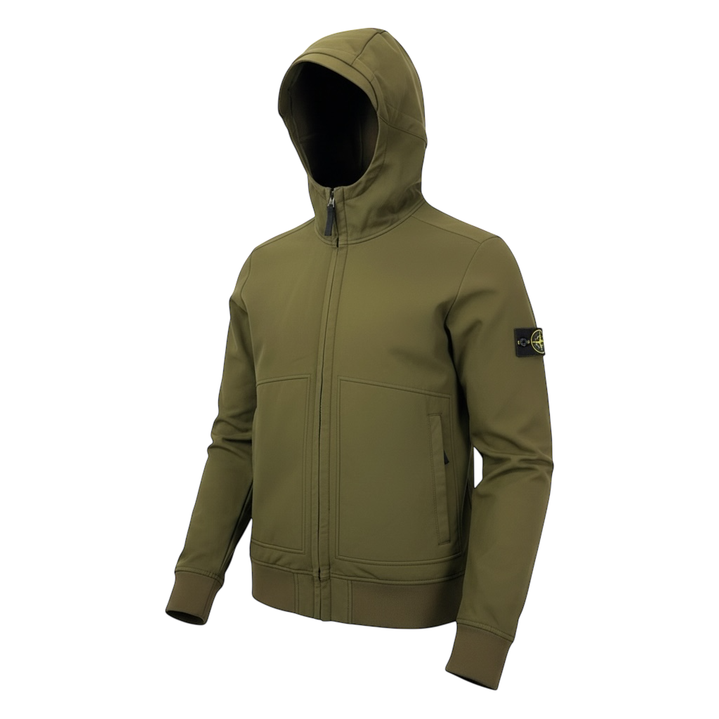 Stone Island veste à capuche zippée, tissu technique lisse vert kaki, grandes poches, poignets élastiqués, patch boussole Stone Island sur la manche gauche, style outdoor/streetwear technique.
