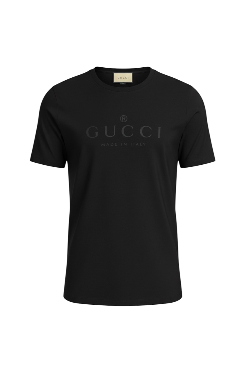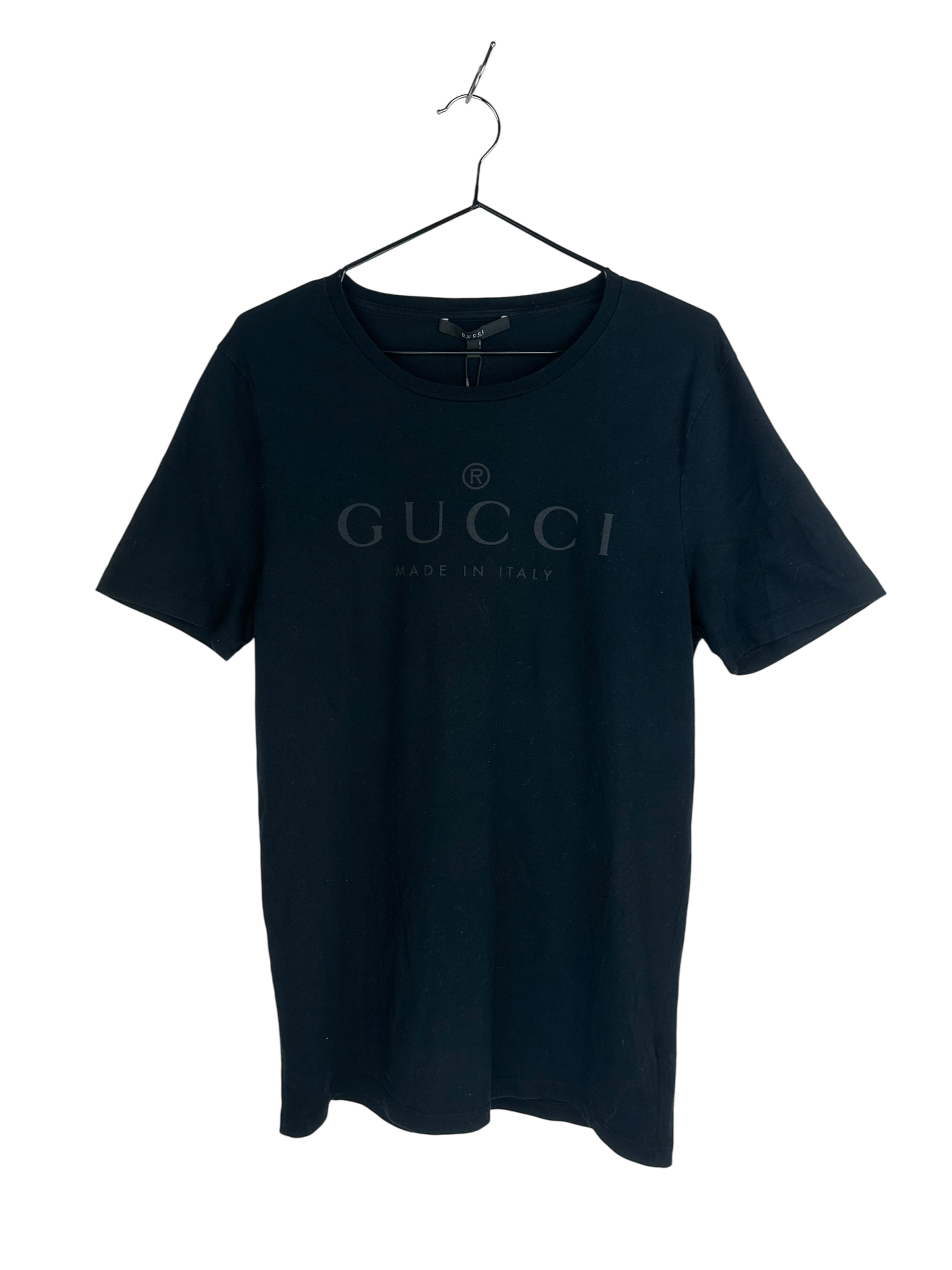 T-shirt noir à col rond, logo GUCCI noir avec inscription 'MADE IN ITALY' sur la poitrine ; tissu coton doux ; étiquette de marque GUCCI visible à l'intérieur.