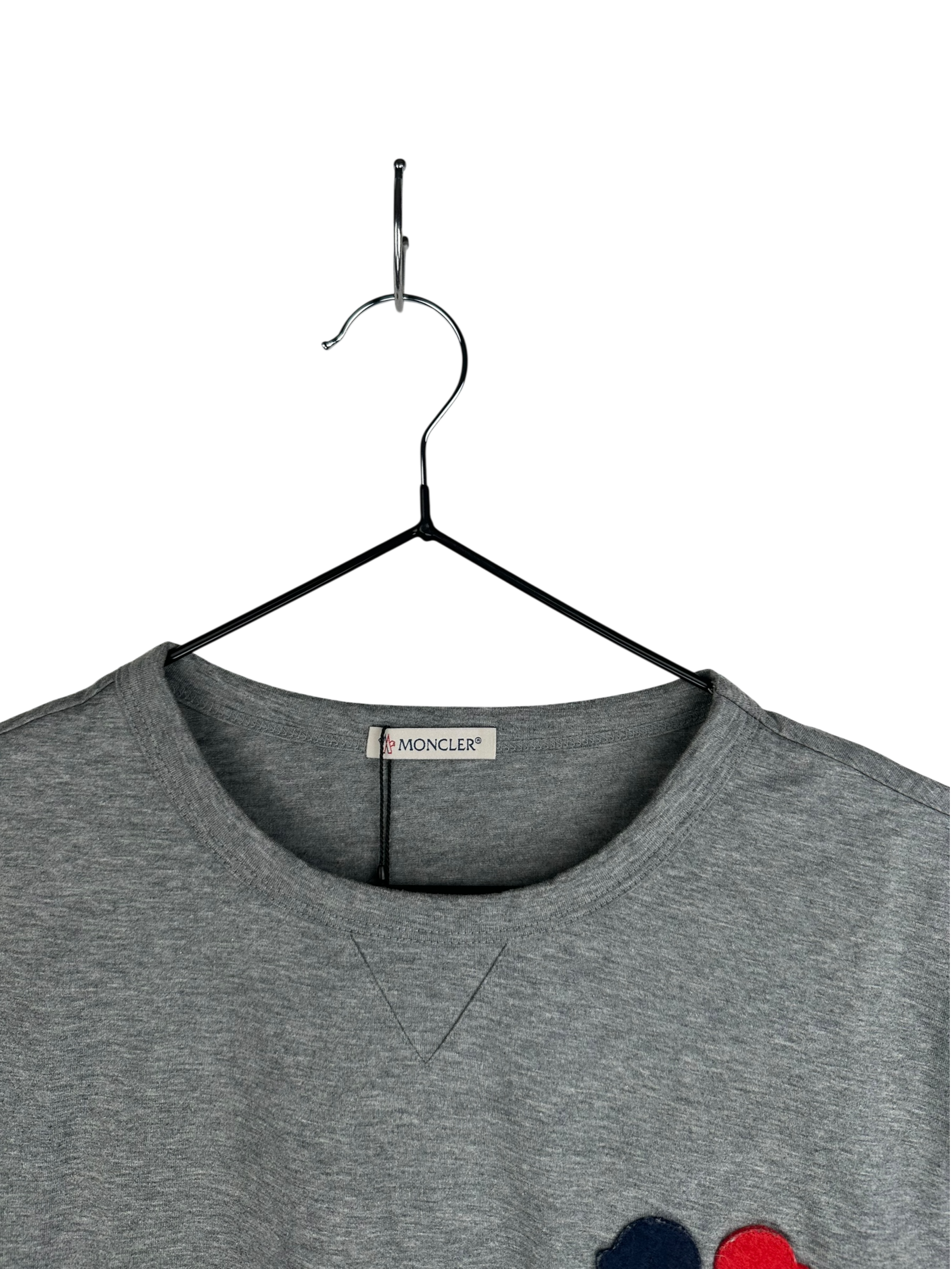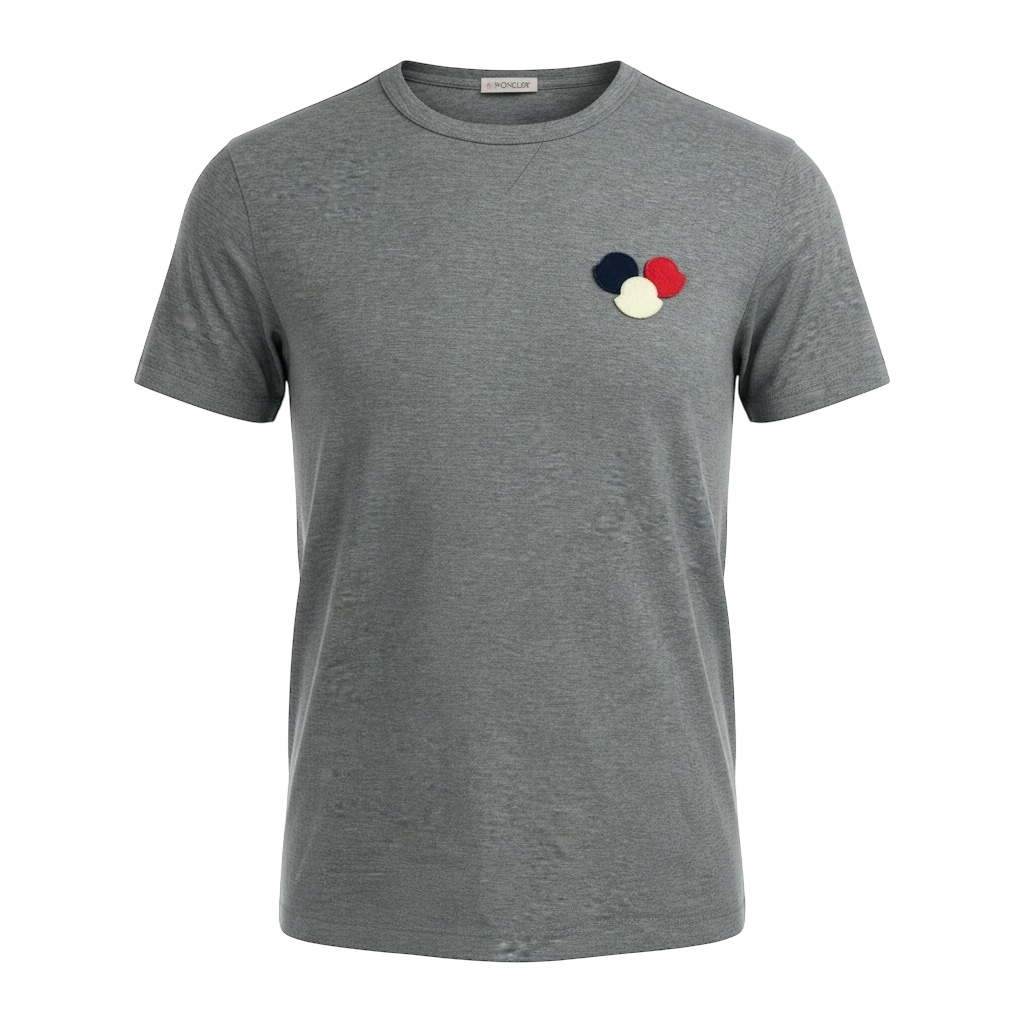 T-shirt Moncler avec un design distinctif en bleu, blanc et rouge, arborant le triple logo emblématique.