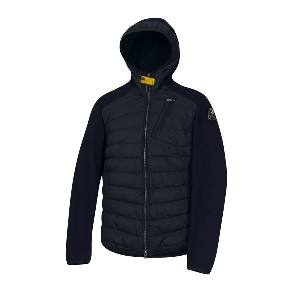 Devant en nylon rembourré matelassé, manches et dos en laine, col montant côtelé, fermeture éclair, poche zippée, écusson brodé Parajumpers sur la manche.